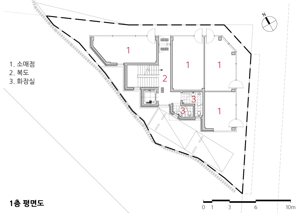 일반적으로 역세권에 위치한 코너 대지는 상업적인 가치가 높다. 때문에 토지의 지가가 주변보다 높고 상점의 임대료도 높게 받을 가능성이 크다. 우리가 건축설계를 의뢰받은 반월역 근린생활시설의 대지는 경기도 안산시에 위치한 4호선 반월역과 매우 가깝다. 반월역에서 약 50미터 내외에 위치한 역세권의 상권을 가지고 있었고, 사거리변의 코너에 위치한다. 클라이언트 측에서 요구한 프로그램은 근린생활시설이었고, 1층의 상점 면적을 최대한 넓게 해달라는 요청이 있었다. 건축법규와 사업성, 주차계획 등의 검토를 통해 사이트에 총 3개 층의 건물을 지을 수 있다는 결론을 내렸다. 작은 대지에 1층 공간을 최대화하고 법정주차 대수를 확보하기 위함이었다.