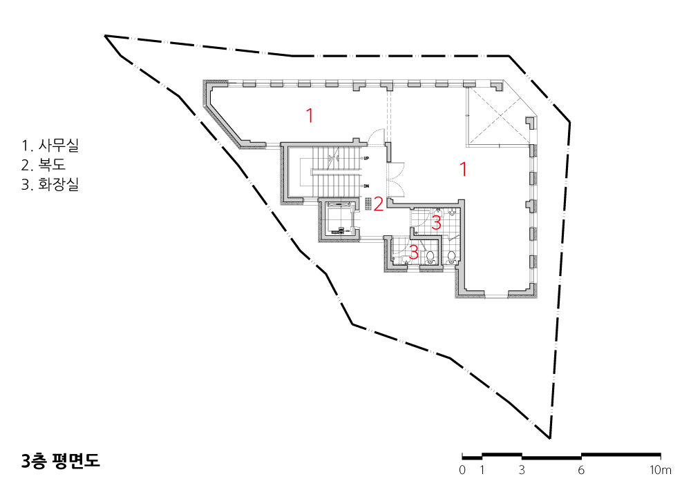 그리고 파르테논 신전의 평면도에서 영감을 받아서 정형적인 평면, 육중한 현무암 재료의 입면 디자인을 통해 주변 컨텍스트와 어우러지는 리테일 공간의 상업성을 확보했다. 직사각형의 반복되는 개구부는 마치 코너를 지탱하는 열주와 같이 디자인하고, 벽체를 코너 부분 방향으로 연장해 코너에 독특한 기념비성을 부여했다. 또한 1층은 개방감 있는 유리로 마감하고 2, 3층은 사무실의 특성에 적합하게 솔리드한 벽면이 돋보이도록 했다. 결론적으로 반월역 근린생활시설 건축디자인은 반월역의 미래 개발 가능성과 상업적 가치를 잘 담고 있는, 고전건축과 현대건축이 융합된 새로운 건축공간으로 사용될 것이다.