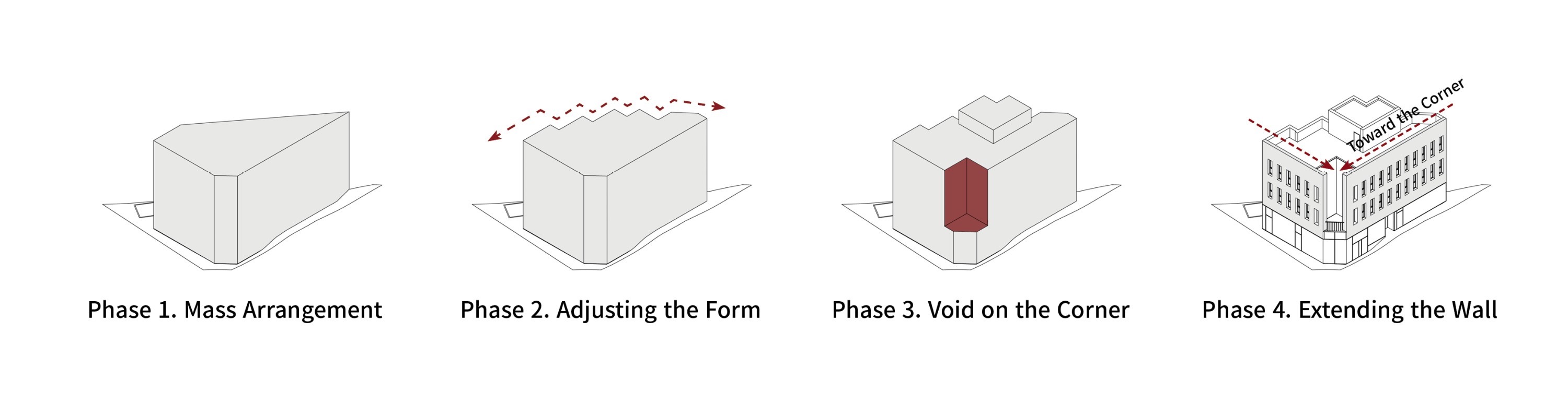 매스와 건축계획에 대한 방향을 클라이언트 측과 협의한 후 건축물의 코너를 돋보이게 하는 방법을 고민했다. 가장 기본적인 건축언어를 다시 생각해 보면서 발상의 전환을 시도했다. 코너를 고전건축에서처럼 정면으로 규정하는 것은 어떨까? 코너 부분에 대한 현대적인 재해석이었다. 파르테논 신전의 파사드에서 육중하면서 휴먼스케일적인 균형과 비례를 표현한 것에서 영감을 얻었는데, 코너 부분에 무형의 보이드 공간을 만들어서 코너 부분에 강력한 건축적 아이덴티티를 부여했다. 비워진 공간은 마치 무형의 기념비성을 나타내는 공간으로서 테라스 공간을 만들어 내·외부 공간이 소통하도록 했다. 또한 테라스에서 하늘을 올려다보면 마치 작은 아트리움과 같은 공간을 경험할 수 있도록 의도했다.
