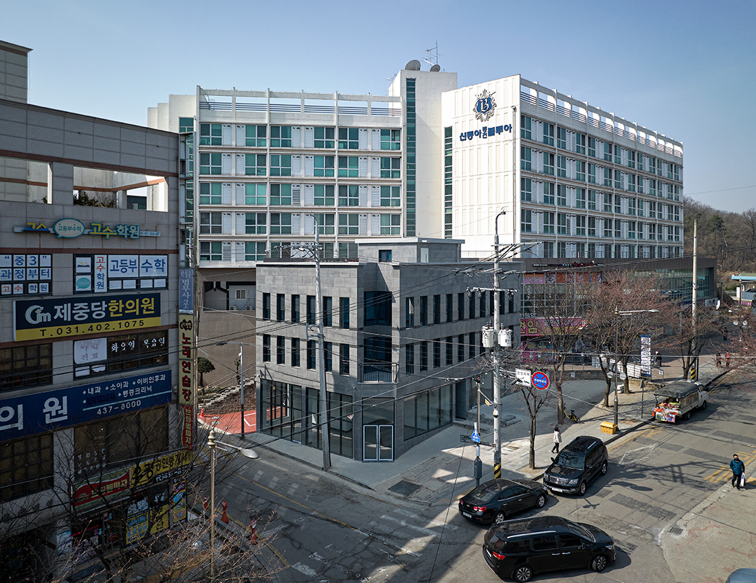 Generally, corner parcel near subway station is invaluable commercially, because of many people and convenient transportation. The site that we are commissioned for commercial uses architectural design is very close to the Banwol station, which is subway number four in Ansan, just 50m away from the station and on the corner parcel. Client group requires us to accommodate several retail spaces and maximize spaces of first floor in the building. Through feasibility and architectural code study, we conclude to build three-story building on the site, in order to make maximum area of first floor and put legal numbers of parking spaces.