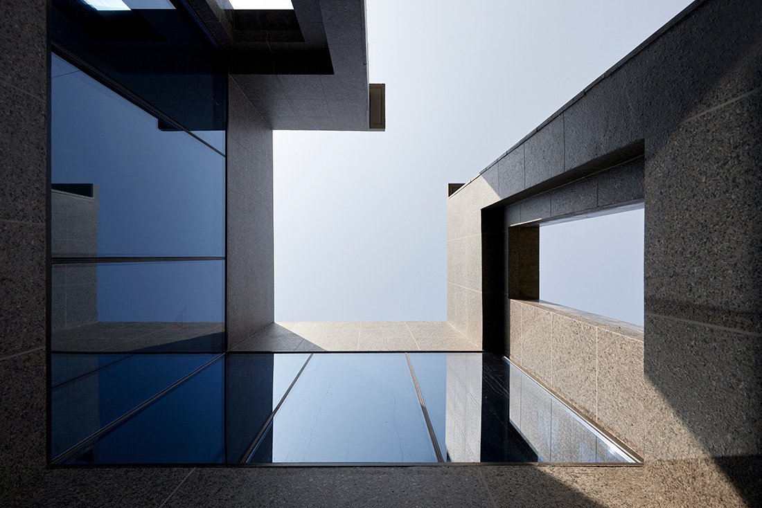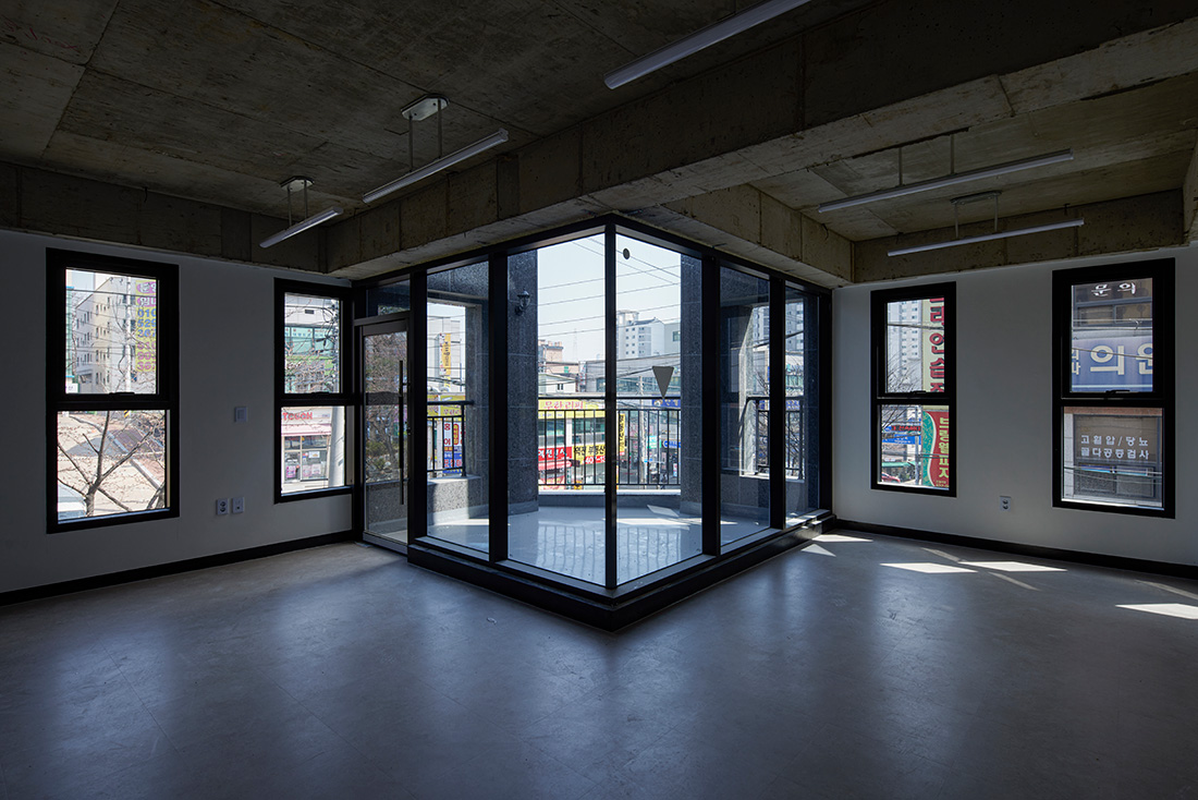 매스와 건축계획에 대한 방향을 클라이언트 측과 협의한 후 건축물의 코너를 돋보이게 하는 방법을 고민했다. 가장 기본적인 건축언어를 다시 생각해 보면서 발상의 전환을 시도했다. 코너를 고전건축에서처럼 정면으로 규정하는 것은 어떨까? 코너 부분에 대한 현대적인 재해석이었다. 파르테논 신전의 파사드에서 육중하면서 휴먼스케일적인 균형과 비례를 표현한 것에서 영감을 얻었는데, 코너 부분에 무형의 보이드 공간을 만들어서 코너 부분에 강력한 건축적 아이덴티티를 부여했다. 비워진 공간은 마치 무형의 기념비성을 나타내는 공간으로서 테라스 공간을 만들어 내·외부 공간이 소통하도록 했다. 또한 테라스에서 하늘을 올려다보면 마치 작은 아트리움과 같은 공간을 경험할 수 있도록 의도했다.