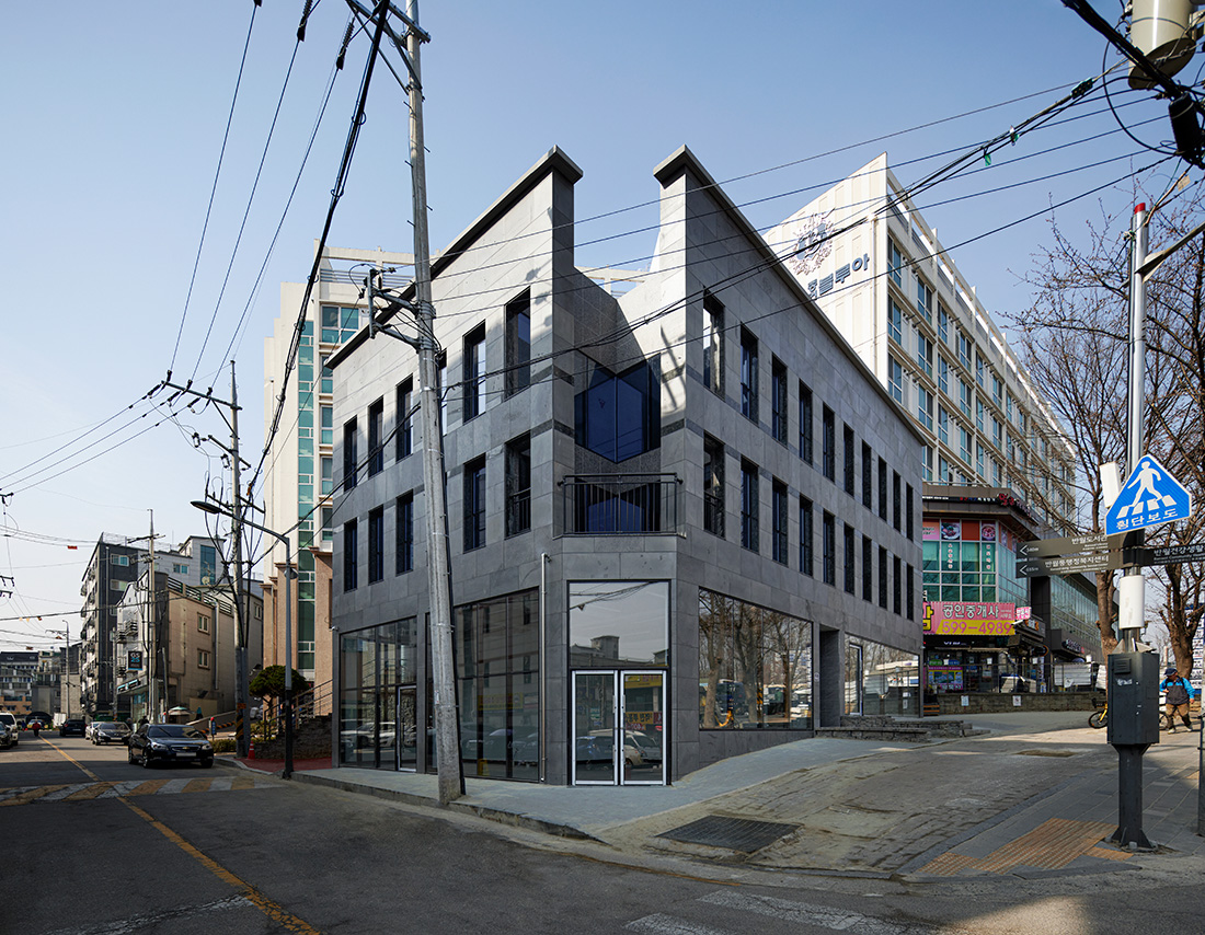 The shape of the site is very irregular like a triangle and aligns to the Korail’s railroad, on which the client cannot build. We proceed several design studies to maximize the area of the first level in relation to the surrounding environment and context. Among various architectural plans, we select a trapezoid formed plan, considered irregular parcel shape and functionality. The trapezoid mass sharp corner toward the subway station and wavy walls on the opposite side. To sum up, walls on the road side are very minimal and clear with wavy facade on the back street side, reacted to general people, satisfying functional and aesthetic architectural aspects.