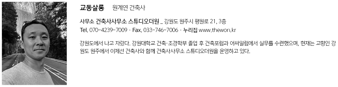 Gyodong Salon Architect | Won, Gyeyeon · Lee Jeseon_ studiothewon Client | Chuncheon city Supervisor | Soyul Architects Construction | TCM global Project team | Lee, Hyesoo / Felix Niemeier Design intention realization | studiothewon Location | 16, Okcheon-gil 40beon-gil, Chuncheon-si, Gangwon-do, Korea Program | Neighbourhood living facility Site area | 1,994.00㎡ Building area | 777.32㎡ Gross floor area | 1,095.88㎡ Building to land ratio | 38.98% Floor area ratio | 54.96% Building scope | A-building _ 2F / B-building _ 1F Structure | RC, Light frame wood structure, Light steel structure Exterior finishing | Brick, Stuco, Asphalt shingles Interior finishing | Exposed wood structure, Wall paper, Polished concrete Design period | Dec. 2020 – Sep. 2021 Construction period | Sep. 2021 – Oct. 2022 Photograph | Park, Wansoon Structural engineer | Arcen, Uwon Mechanical engineer | Seonin eng Electrical engineer | Seonin eng Fire engineer | Seonin eng |