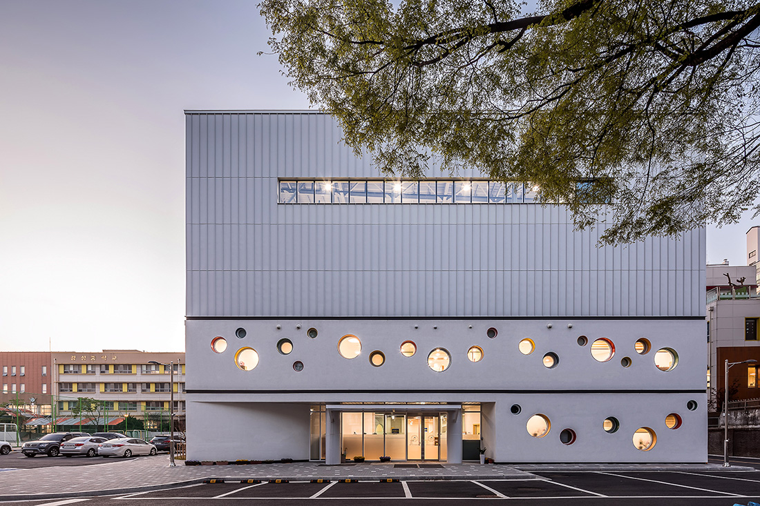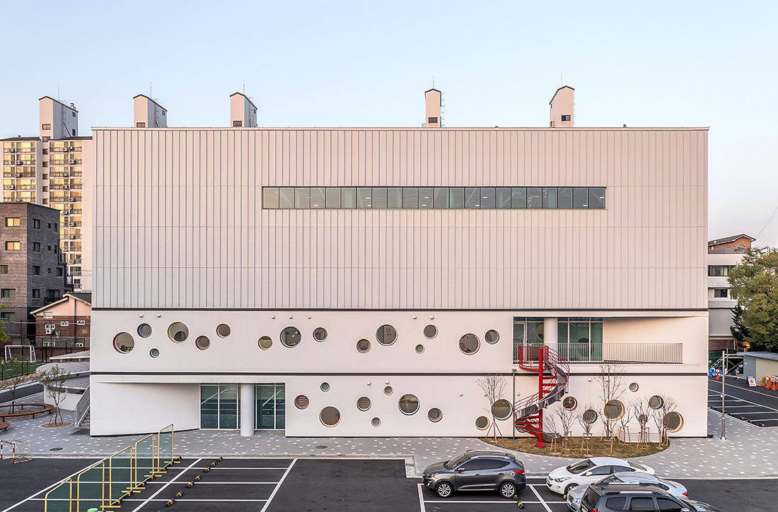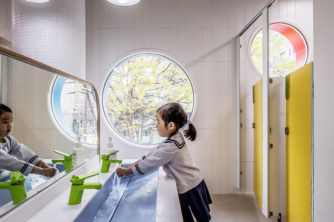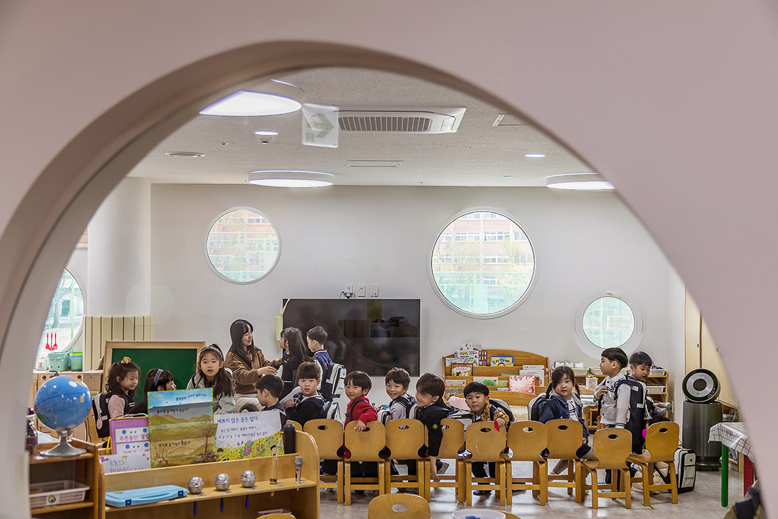 아이들의 눈높이에 맞춘 다양한 크기의 동그라미 창문을 외벽과 실내에 배치해 호기심을 자극하는 유치원을 계획했다. 다양한 높이로 배치된 창문을 통해 아이들에게 시각적인 연계성, 리듬감, 앉아서 보는 투시적 경관 등의 뜻밖의 경험을 제공한다. 창호의 다양한 색채는 아이들에게 또 다른 흥미를 불러일으킨다.