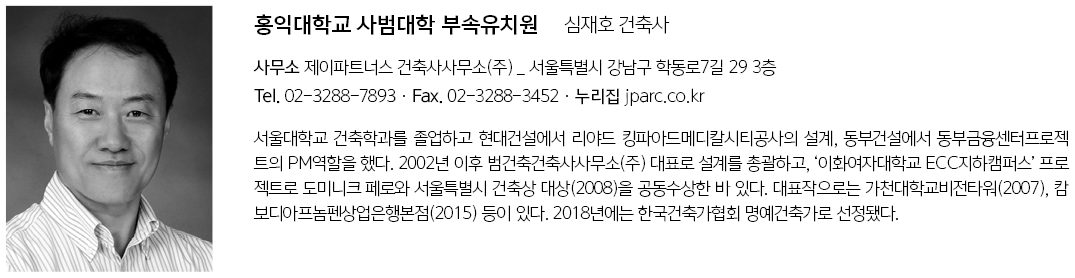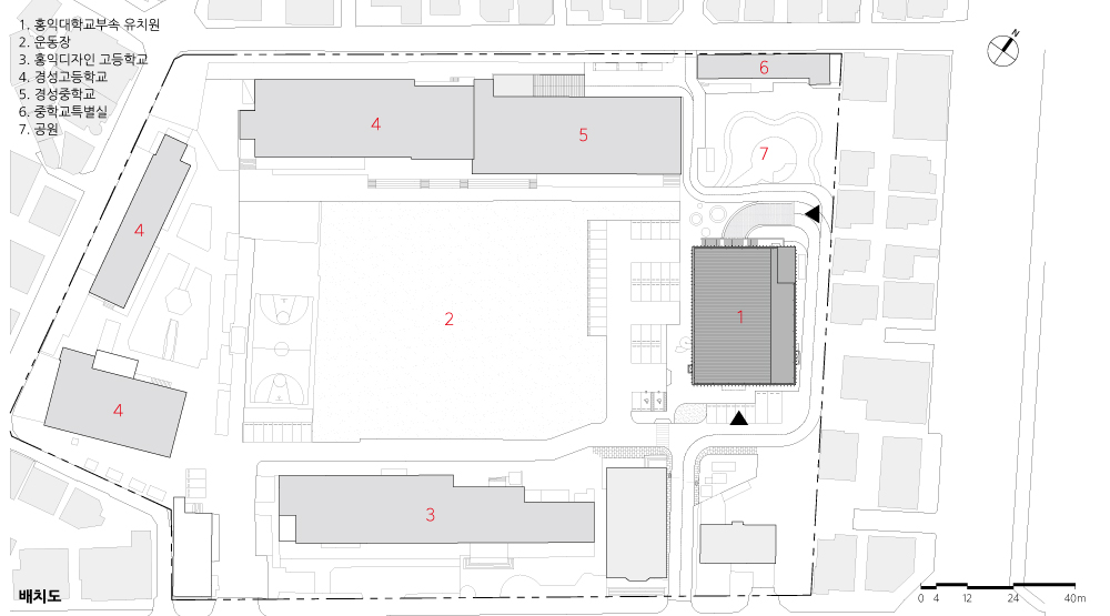 | 홍익대학교 사범대학 부속유치원 설계자 | 심재호 _ 제이파트너스 건축사사무소(주) 공동설계 | 배정현 폴(AIA) 건축주 | 학교법인홍익학원 감리자 | 제이파트너스 건축사사무소(주) 시공사 | 일광E&C(주) 설계팀 | 심은지, 변현호, 류지형, 백제현 설계의도 구현 | 제이파트너스 건축사사무소(주) 대지위치 | 서울특별시 마포구 성미산로 111 주요용도 | 교육연구시설(유치원, 학교) 대지면적 | 26,466.40㎡ 건축면적 | 6,729.63㎡ (유치원 : 965.89㎡) 연면적 | 27,587.93㎡ (유치원 : 3,408.54㎡) 건폐율 | 25.42% 용적률 | 89.62% 규모 | 10동, B1F - 5F (유치원 : B1F - 3F) 구조 | 철골철근콘크리트조 외부마감재 | 백색 스타코플렉스, 진한회색 메탈, 백색 Sky ZIP 시스템 패널, 로이복층유리 및 5가지 칼라 페인트 내부마감재 | 온수판넬히팅위 비닐계 데코타일(바닥), 석고보드위 친환경 수성페인트(벽체), 단풍나무후로링(3층체육관바닥) 설계기간 | 2019. 10 – 2021. 10 공사기간 | 2022. 06 - 2023. 12 사진 | 홍성준 _ 디자인예감 구조분야 | (주)단구조 기계설비·소방분야 | (주)우원엠앤이 전기분야 | (주)협인전기설계 |