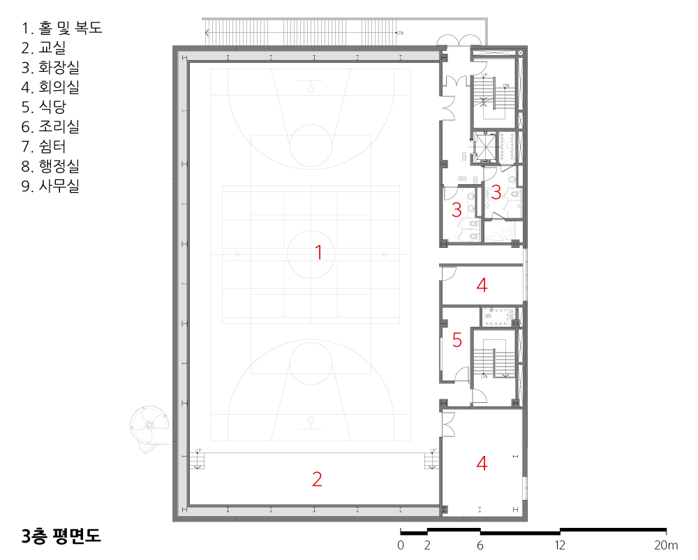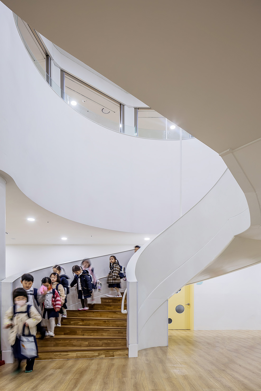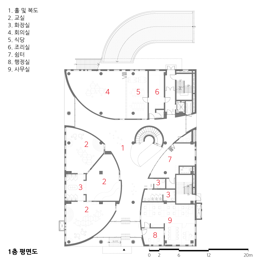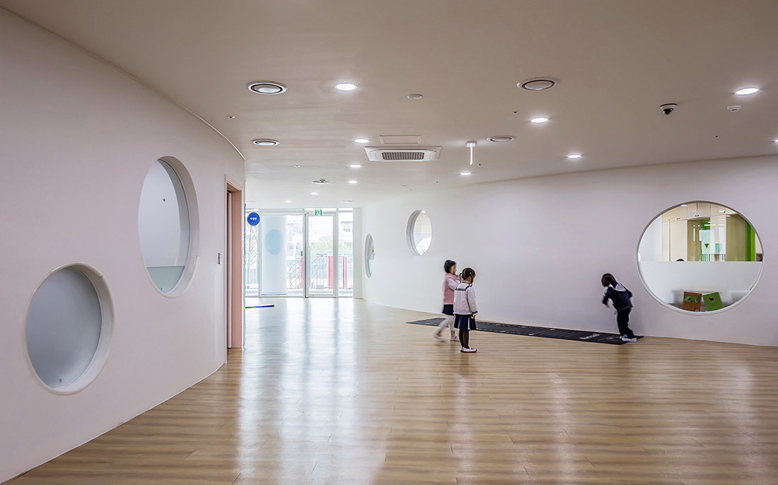 상부 체육관을 고려한 직사각형의 효율적인 유치원 매싱과 대조되는 동그라미 내부 공간은 일반적인 중복도 교실 배치를 탈피해 형태와 구조의 효율성을 유지하면서 곡면을 사용한 실내공간을 구성했다. 반원형 교실의 사이 공간으로 구성된 공용공간은 복도 기능 외에 놀이공간, 만남의 공간 등으로 활용될 수 있으며, 곡면이 주는 형상은 아이들의 창의력과 호기심을 자극한다.