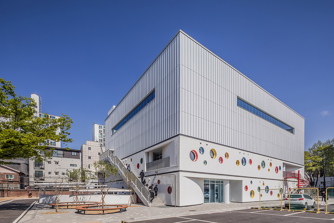 The Hongik University Kindergarten shares its campus with Kyungsung Middle and High Schools as well as Hongik Design High School. With due consideration to complementing the existing buildings and optimizing the available space, an efficient rectangular form was planned. The circular motif was thoughtfully integrated into the overall design, encompassing aspects such as layout, exterior features, lighting, signage, and more, to invigorate the campus atmosphere and foster environments that inspire the inquisitiveness of kindergarten students.