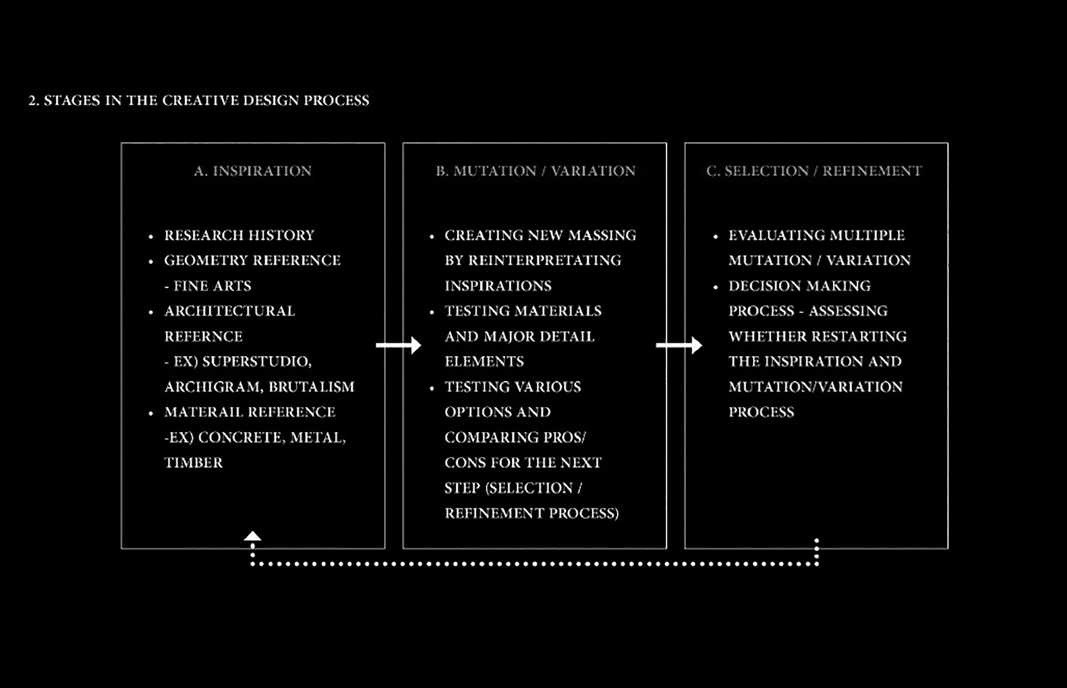 유럽과 뉴욕에서 실무 경험을 콘셉트 기반의 디자인 오피스에서 주로 경험해 본 결과(건축을 비롯한 음악, 예술, 디자인에서의 창조적 디자인 프로세스에 대해서는 수많은 방법론이 있지만), 필자가 파악한 창조적 디자인 프로세스에서는 어느 정도의 일관된 공통적 논리 구조를 발견할 수 있었고, 다음과 같은 3단계로 요약할 수 있다.