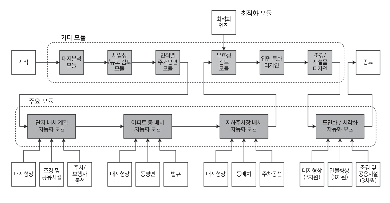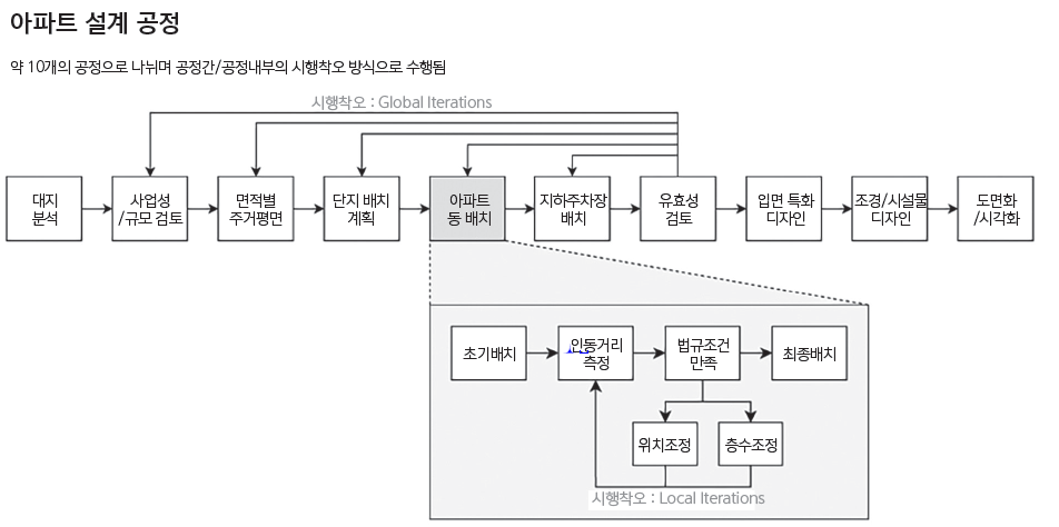 화학적인 디자인 과정을 논리적인 연속성을 가지는 연산의 단위로 구분하고, 이를 인공지능 및 규칙기반의 도구를 활용하여 재정의한다면, 건축사는 주어진 시간을 더욱 효율적으로 활용해 더 많은 창작의 기회를 누릴 수 있다고 생각한다. <그림 6> 이를 위하여 건축사들은 건축사들의 의식의 흐름을 구조화하고, 노하우를 집단지성으로 전환하려는 노력이 필요하며, 새로운 시대에 걸맞은 새로운 디자인 프로세스를 디자인하는 데 동참해야 할 것이다.