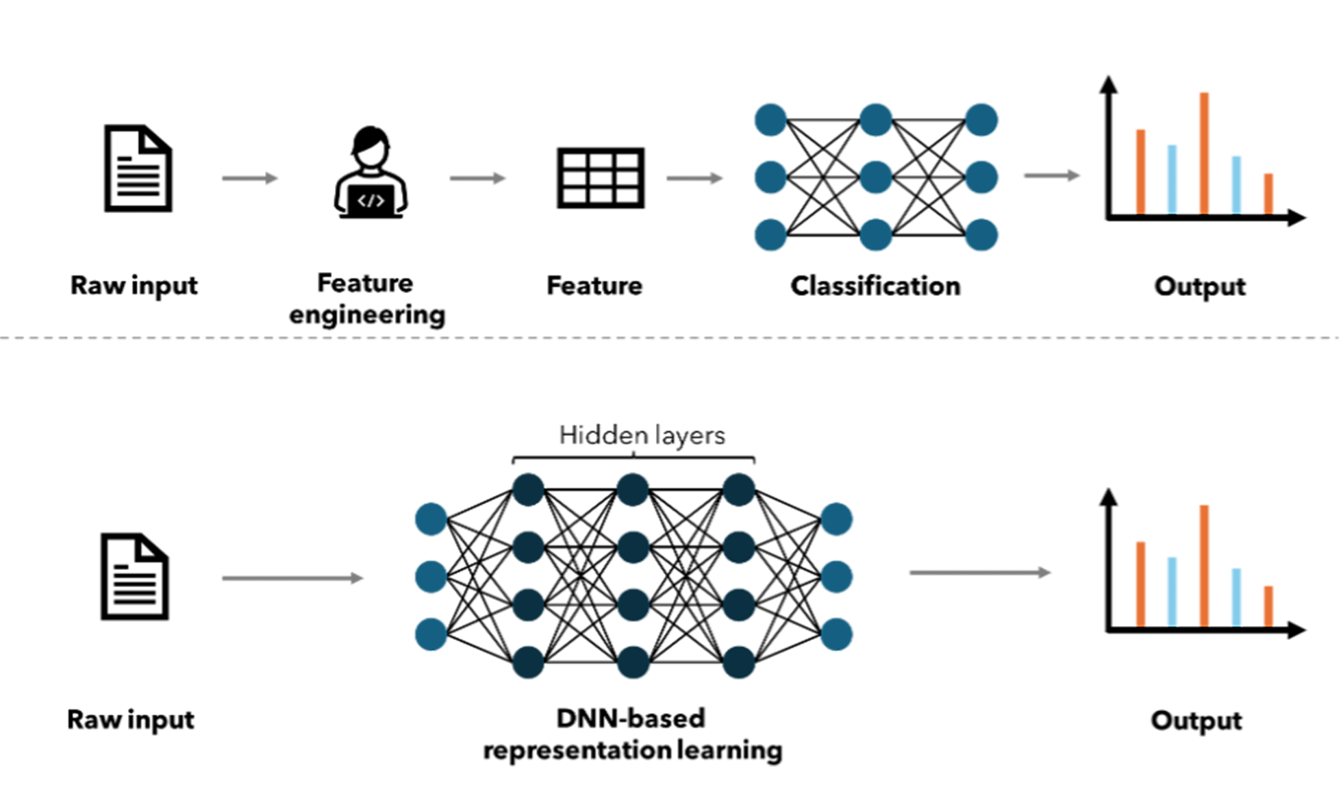 인공지능은 상술하였듯이 인간지능의 기계학적인 이해를 바탕으로 한다. 이는 다양한 방식의 인공신경망 형태로 구현되며, 공히 다수의 미지수인 계수를 포함하는 여러 개의 레이어를 거쳐 입력데이터를 판독하고 결괏값을 산출한다. 학습이라고 불리는 과정을 거쳐 특정 문제에 대한 입력값과 판독 값의 오차를 줄여나가는 방식으로 미지수인 계수를 결정하고, 이를 통하여 특정 작업에 특화된 모델을 비로소 완성한다.