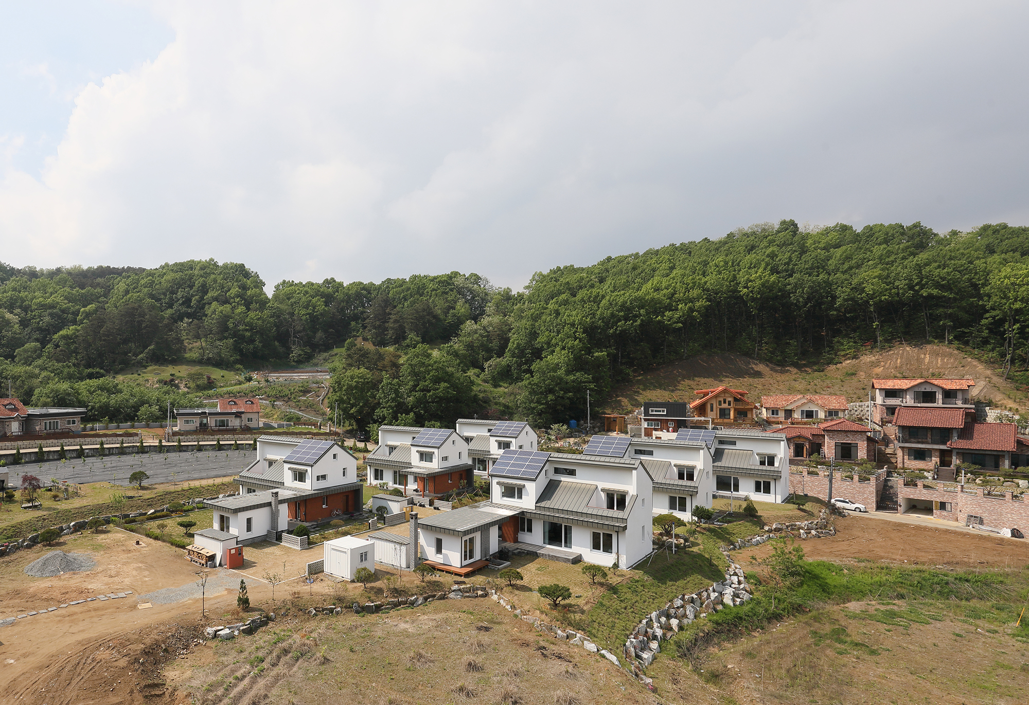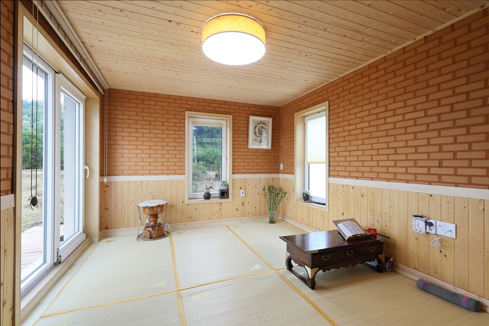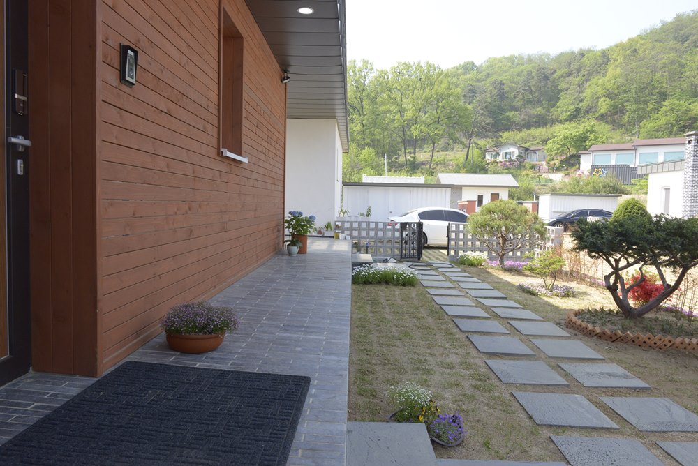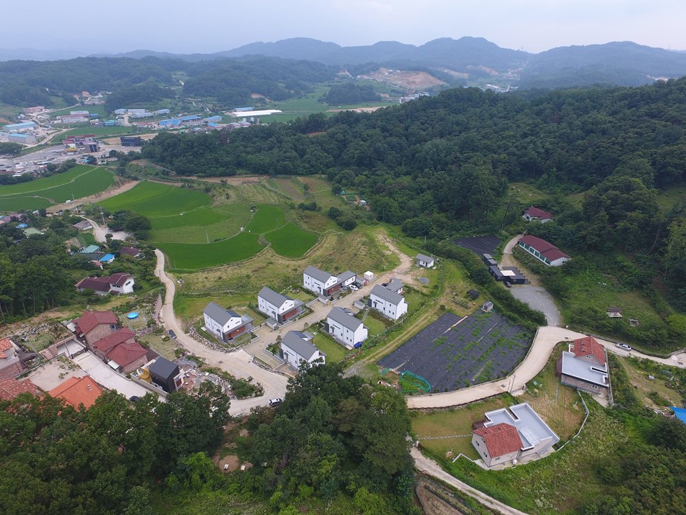 Yangchon, Ga-on passive housing community is started with three developers purchasing the land together. In total of 8 lots, each has a passive house and a separated Hwangto-clay paved annex building. Annual heat energy consumption for the building is 2.7 liter, and it is a certified building by Korea Passive house Association. Currently, 6 houses are completely built and 2 are under construction.