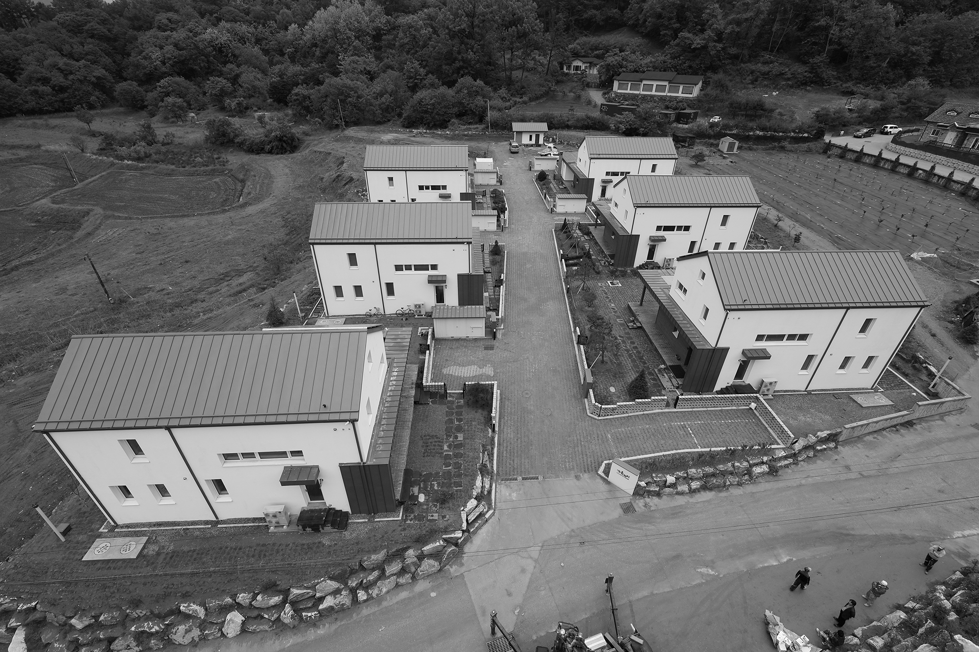 In order to form the unity, every building has to be built as eco-friendly passive house. Using same exterior material and having similar roofing form was another factor to keep its unity. Houses are separated with plants.