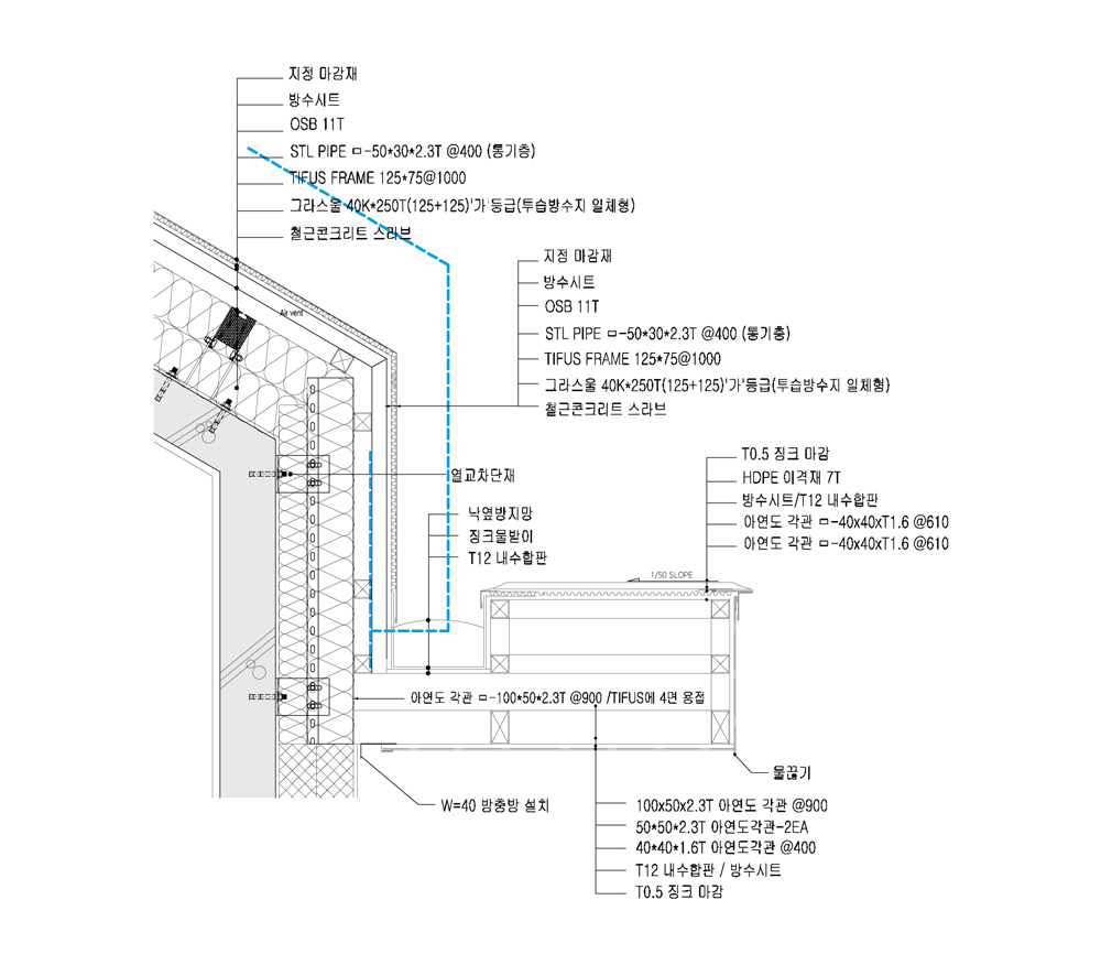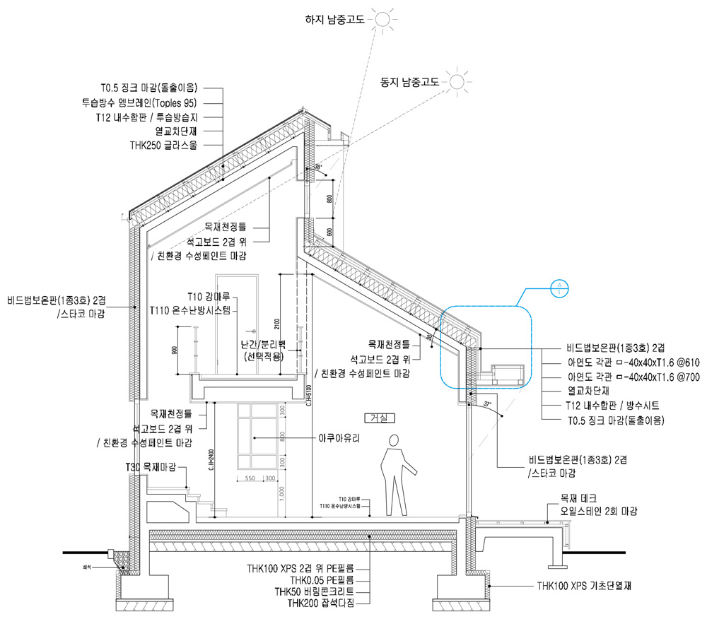 패시브하우스는 목표하는 난방에너지 사용량을 맞추기 위해 콤팩트한 매스, 일사량을 계산한 차양설계, 기초단열을 포함한 고단열, 고기밀 삼중창호, 열교없는 디테일 설계로 설계단계에서 재료의 성능검토와 선정이 이루어진다.