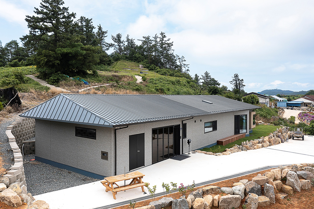 국내 목조주택은 현재 북미식 경골 구조와 일본식 중목 방식이 혼재되어 있습니다. 안타깝지만 모두 해외에서 개발된 방식이 그대로 수입되다 보니, 구법서부터 나무, 철물, 기타 부자재 등에 이르기까지 수입 의존도가 높다는 특징을 갖습니다. 이는 보다 합리적인 가격으로 주택 시장 저변 확대를 가로막는 요인이 되기도 합니다. 얼마 전 완공한 ‘완도주택’은 이를 개선하고자, 국내의 프리컷 공장을 통해 중목구조의 장점인 구조미와 경골 목구조의 장점인 단열성능을 혼합시킨 사례로, 국산화된 K-목조 주택의 가능성을 구현한 프로젝트입니다.