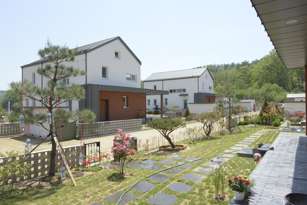 Yangchon, Ga-on passive housing community is started with three developers purchasing the land together. In total of 8 lots, each has a passive house and a separated Hwangto-clay paved annex building. Annual heat energy consumption for the building is 2.7 liter, and it is a certified building by Korea Passive house Association. Currently, 6 houses are completely built and 2 are under construction.