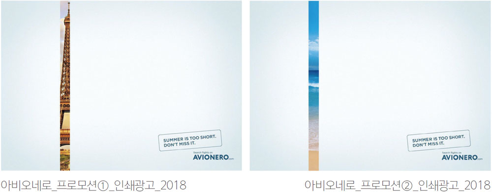 아래의 이미지는 여름을 맞아 흥분한 사람 중 한 명이 만들었을 것 같은 러시아의 인쇄광고다. 『아비오네로』(Avionero)라는 항공권 예약 사이트의 광고인데 파 리의 에펠탑이 다 보이지 않고 잘려서 보인다. 아름다운 바닷가의 모습도 문틈으로 보는 것 처럼 아주 조금 밖에 안 보인다.