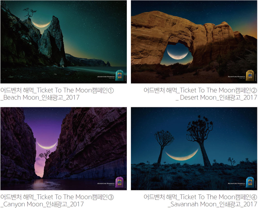 이 캠 페인은 경치 좋은 곳을 찾아 나무 사이에 해먹을 매달고 휴식을 즐기는 사람들의 습관에 착안 하여 멋진 경치를 배경으로 사용했다. 해변의 달, 협곡의 달, 사막의 달, 대초원의 달 모두 4편 으로 만들어졌는데 착시효과 때문에 아름다운 하늘에 걸린 초승달이 해먹처럼 보인다.어드 벤처 해먹에 누우면 아주 편안하고 고요한 시간을 가질 수 있다는 메시지를 카피 한 줄도 없 이 사진 한 장만으로 강렬하게 표현하고 있다.