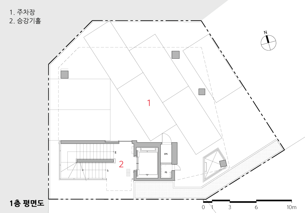 임대형 사무소 건물에 부합하도록 1층은 최대한의 주차 대수를 가질 수 있는 필로티 주차장으로만 구성했고, 2~4층은 대지 형상 내에서 가능한 넓은 바닥면적을 가지도록 계획했다. 정북일조 높이제한에 의해 매스가 후퇴하는 5층은 바닥면적을 조금이라도 더 확보하기 위해 외부 계단 방식의 계단실을 적용해, 각 층에서 공제받은 외부 계단 면적을 5층 면적 증대에 이용했다. 결과적으로 5층은 대표실에 적합한 규모이면서 고즈넉한 주거지역으로, 트인 전망과 테라스를 가진 이 건물에서 가장 좋은 공간이 되었다.