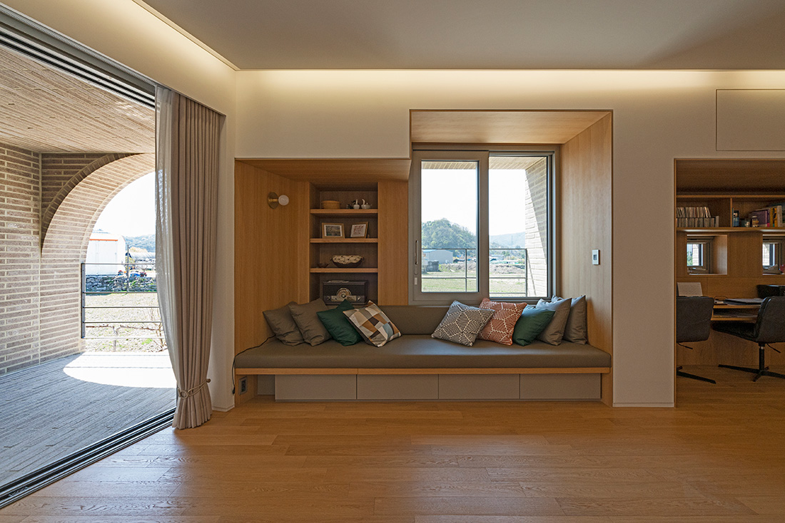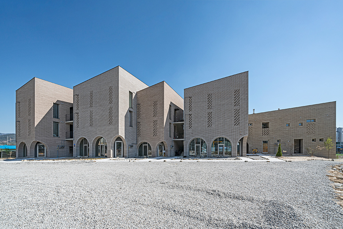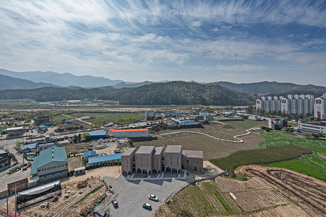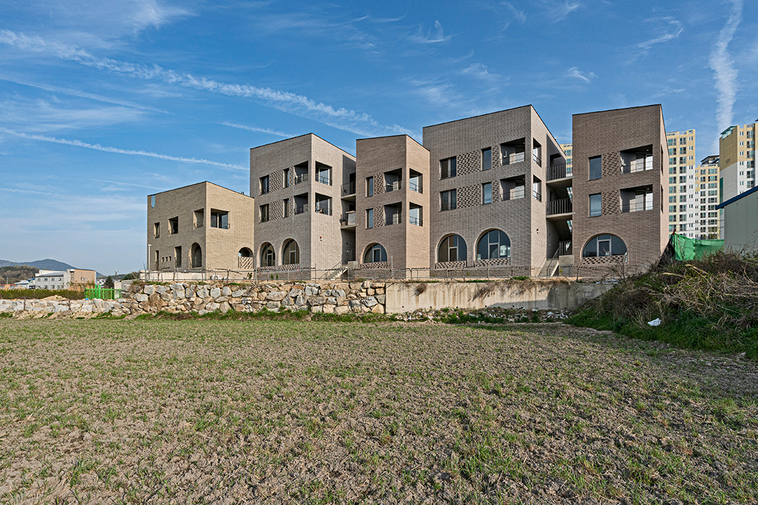 Located on the outskirt of Namwon city, the site is widely open to rice fields to its South and an apartment complex across a steet to the North. As a chief surgeon and the owner of a local clinic, the client had long wished to build a group housing that would provide home for his staffs, doctors and nurses. With rental stores on the ground floor and the client’s own family home as a part of the housing, the building is to serve multiple programs and user groups with varying needs. Moin Houses found its linear form along the Southern border of the site in order for all the residents and tenants to appreciate even condition of daylight and the open view towards Jirisan to the South. The overall form of the building and the loos links between the units are comparable to multifamily homes in urban context which tend to attain much higher density in a tighter volume. Considering the fact that the residents will be neighbors at home and coworkers at work on an everyday basis, one of the main purposes for the project was to gain proper distances between units both physically and socially.