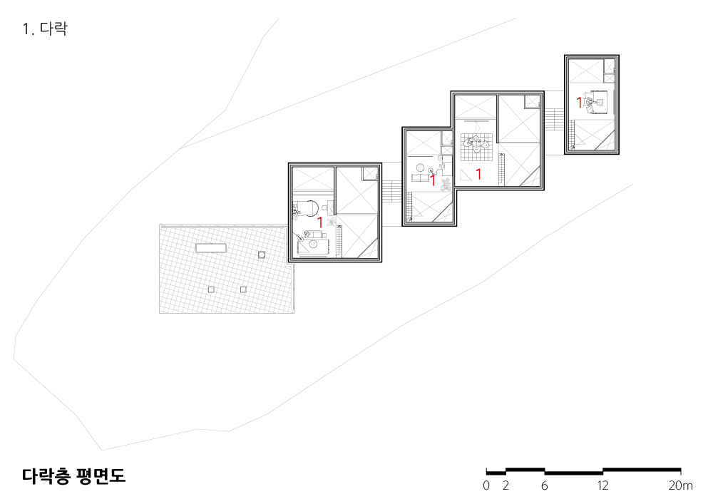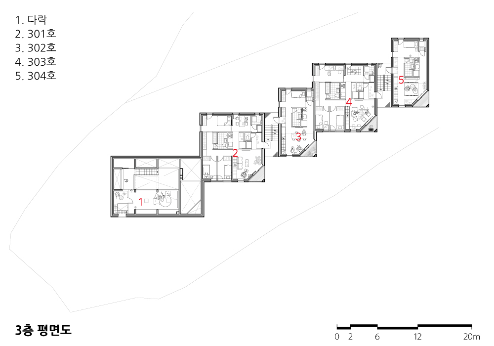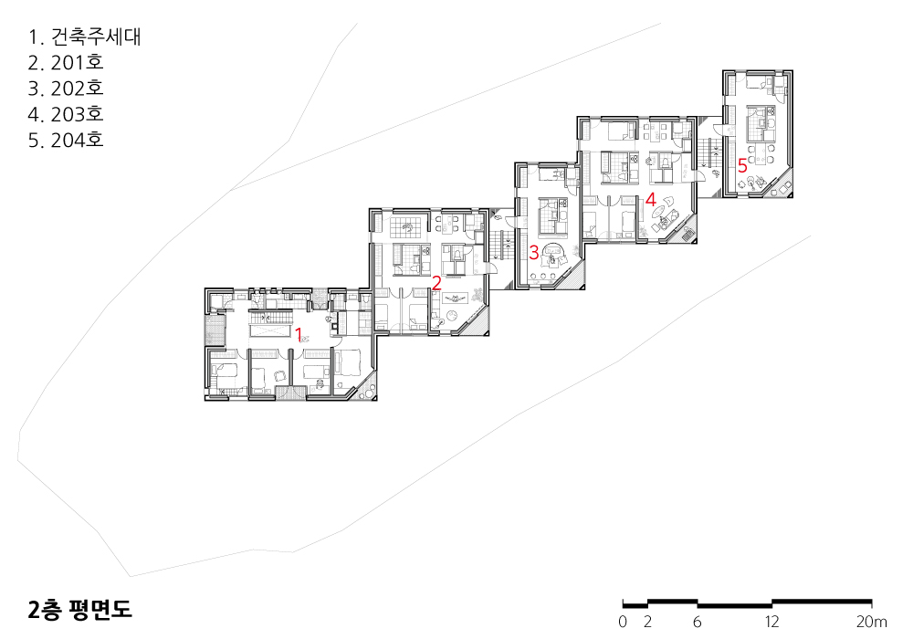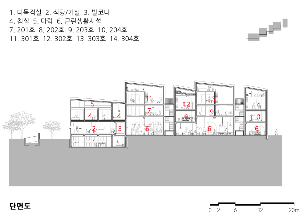 소규모 다가구 주택에 사는 사람들이 적절한 유대를 형성하고 개인의 집이 독립적인 영역을 향유하기 위해서는 세대 간 적정 거리가 필요하다. 건축주의 집, 직원 주택, 상업시설로 이루어진 월락동 여러집은 다양한 필요와 성향을 지닌 각각의 사용자 간의 바람직한 관계 정립을 주요 목표로 삼았다. 도심에 지어지는 많은 중규모 근린생활시설이 도로와 가까운 층에 상가를 들이고, 중간 층에 임대용 주거를 배치한 후 최상층을 건물주의 집으로 삼는 주된 이유는 이러한 구성이 각 프로그램의 필요를 충족하는 동시에 임대 수익 창출에 가장 효율적이기 때문이지만, 이는 사생활 침해 확률이 적고 경관은 더 좋은 최상층을 선점하는 건물주와 그 아래 입주하는 세입자 간의 수직적 관계의 직접적으로 보여준다. 월락동 여러집은 저층 상가와 상층 직원주거로 이루어진 동이 남동쪽 대지경계선을 따라 길게 늘어서고, 그 행렬 끝에 건축주의 집이 가장 낮게 가라앉은 모습으로 닿아 전체의 수평적 관계를 완성한다. 각 동에 배치된 상업공간과 주호는 층에 상관없이 북쪽과 남쪽을 향해 같은 환경을 공유하고, 분절된 동과 동 사이는 건물의 북쪽과 남쪽 마당을 잇는 통로, 층별 주호로 인도하는 외부 계단실, 그리고 각 집으로 들어가는 문 앞 빈 공간으로 채워진다.