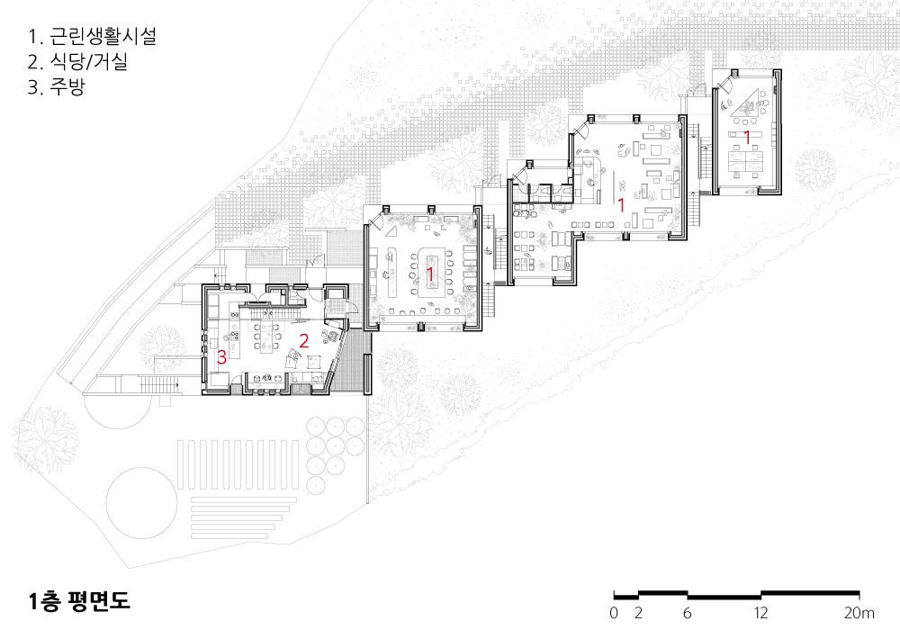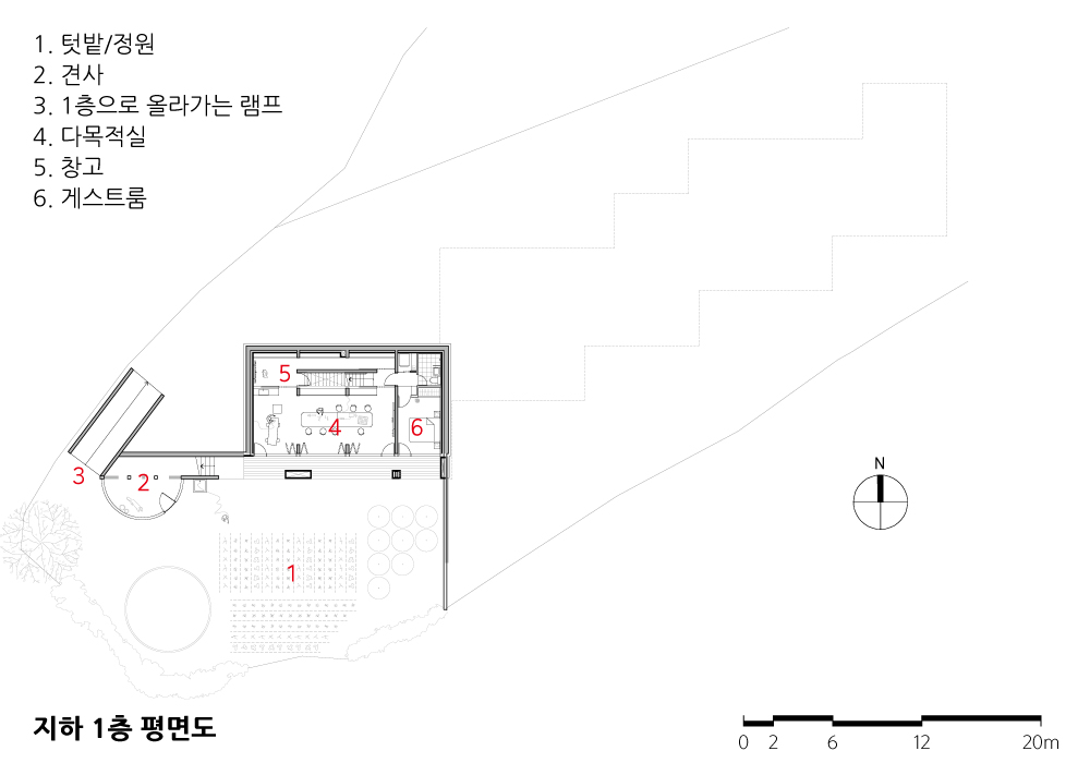 전라북도 남원시 도심 외곽에 놓인 대지는 북쪽으로 도로와 아파트 단지를 면하고 남쪽으로 지리산과 논밭을 향해 열려있다. 매입한 대지에 여러 해 동안 농사를 짓고 가금류를 키워 온 건축주는 저층 상업시설과 상부 공동 주거로 이루어진 건물을 계획했는데, 이는 건축주가 운영하는 의료시설 직원에게 복지 주택을 제공하기 위함이었다. 1층에 들어오는 상업시설이 북쪽 도로로부터 적정 거리에 놓이는 동시에 여러 주호가 동등한 경관과 향을 누릴 수 있도록 건물은 남쪽을 주향으로 삼은 후 대지 경계선에 맞게 조율됐다. 규모에 비해 높이가 낮고 길이가 긴 건물은 몇 번의 분절을 통해 전체와 부분이 입체적이고 느슨한 관계를 맺는 점에서 도심지의 소규모 복합용도 건물의 수직적이고 고밀한 구성과 구별되는데, 일터와 집에서 맺는 이웃 간 관계에 적절한 거리와 차이를 두려는 의도의 결과이기도 하다.
