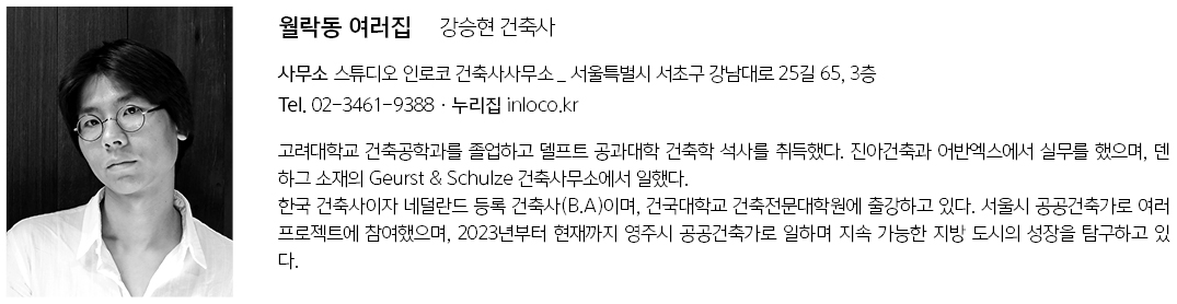 | 월락동 여러 집 설계자 | 강승현 _ 스튜디오 인로코 건축사사무소 공동설계 | 김나운(네덜란드 건축사) 건축주 | 김진영, 유지선 감리자 | 강승현 _ 스튜디오 인로코 건축사사무소 시공사 | 코워커스 설계팀 | 임형준 대지위치 | 전북특별자치도 남원시 용성로 338 주요용도 | 다가구주택 대지면적 | 2,144㎡ 건축면적 | 412㎡ 연면적 | 976㎡ 건폐율 | 19.20% 용적률 | 40.59% 규모 | B1F - 3F 구조 | 철근콘크리트구조 외부마감재 | 시멘트벽돌, 듀라스텍 내부마감재 | 도장, 목재, 벽지 설계기간 | 2018. 03 - 2018. 09 공사기간 | 2019. 02 - 2021. 04 사진 | 황효철 구조분야 | 더원구조엔지니어링 기계설비·전기·소방분야 | 제이유엔기술단 |