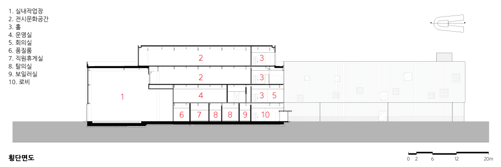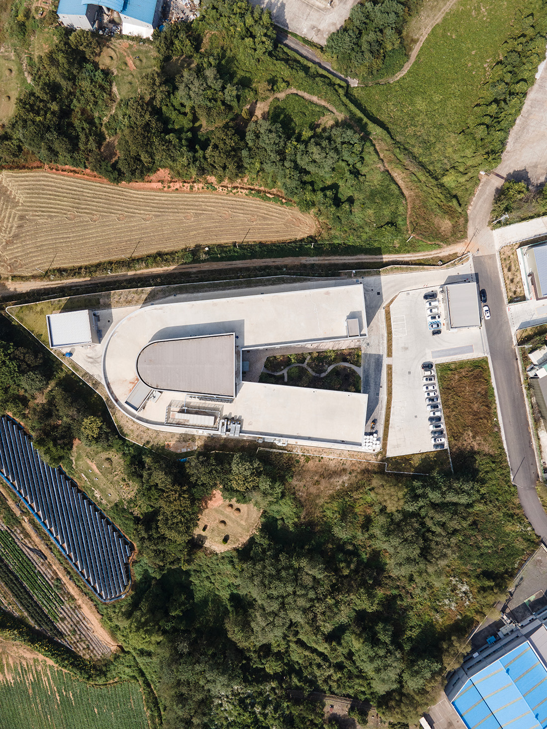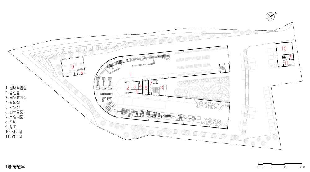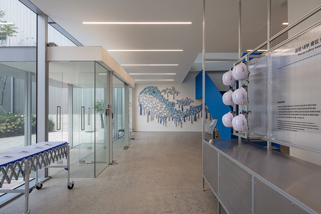 To accommodate the necessary machinery for the basic functions of a waste facility, a spacious area needed to be secured. The collected PET goes through a preprocessing, grinding, washing, drying, and sorting process using specially designed and arranged machines, resulting in purified flakes as the final product. To ensure the placement of machines within the limited 9,886 square meters of land, a U-shaped building layout was adopted, providing a minimum width of 15 meters and a length of approximately 150 meters. This U-shaped arrangement, following the production process, created a new type of building that can efficiently accommodate additional functionalities. The elongated workspace allows for stable machine operation on a single floor, while the upper side of the U-shape organizes the movement of vehicles. Inside the U-shape, spaces for offices, exhibitions, and cultural activities are concentrated, allowing for easy observation of the approximately 150-meter production process at a glance. The resulting building is clear and easily comprehensible.