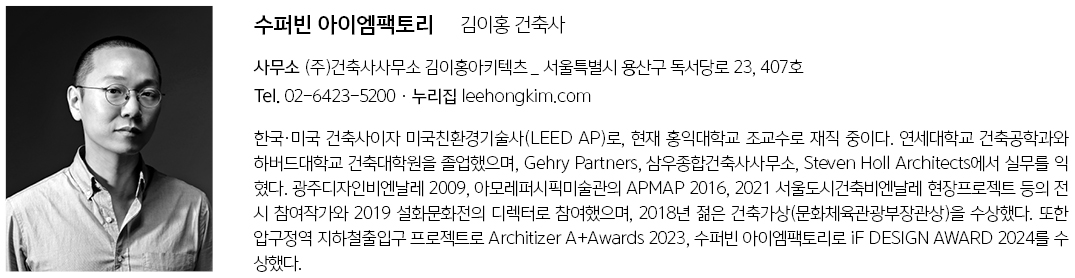 | 수퍼빈 아이엠팩토리 설계자 | 김이홍 _ (주)건축사사무소 김이홍아키텍츠 건축주 | 수퍼빈(주) 감리자 | (주)건축사사무소 수목21 설계팀 | 김현주, 강정구 설계의도 구현 | (주)건축사사무소 김이홍아키텍츠 대지위치 | 경기도 화성시 우정읍 사기말길 27번길 87-41, 87-39 주요용도 | 자원순환관련시설, 제 2종근린생활시설98 대지면적 | 9,886.00㎡ (A,B동) / 1,831.00㎡ (C동) 건축면적 | 3,710.50㎡ (A,B동) / 184.40㎡ (C동) 연면적 | 5,336.59㎡ (A,B동) / 184.40㎡ (C동) 건폐율 | 37.53% (A,B동) / 10.07%(C동) 용적률 | 53.52% (A,B동) / 10.07%(C동) 규모 | 4F(A동) / B1F - 1F(B동) / 1F(C동) 구조 | 일반철골구조 외부마감재 | 금속패널, 시멘트블록 내부마감재 | 금속패널, 석고보드 위 페인트 설계기간 | 2021. 04 – 2021. 10 공사기간 | 2021. 11 – 2022. 11 사진 | 홍기웅 구조분야 | 건축구조연구소 다우 기계설비·전기·소방분야 | 선이엔지 |