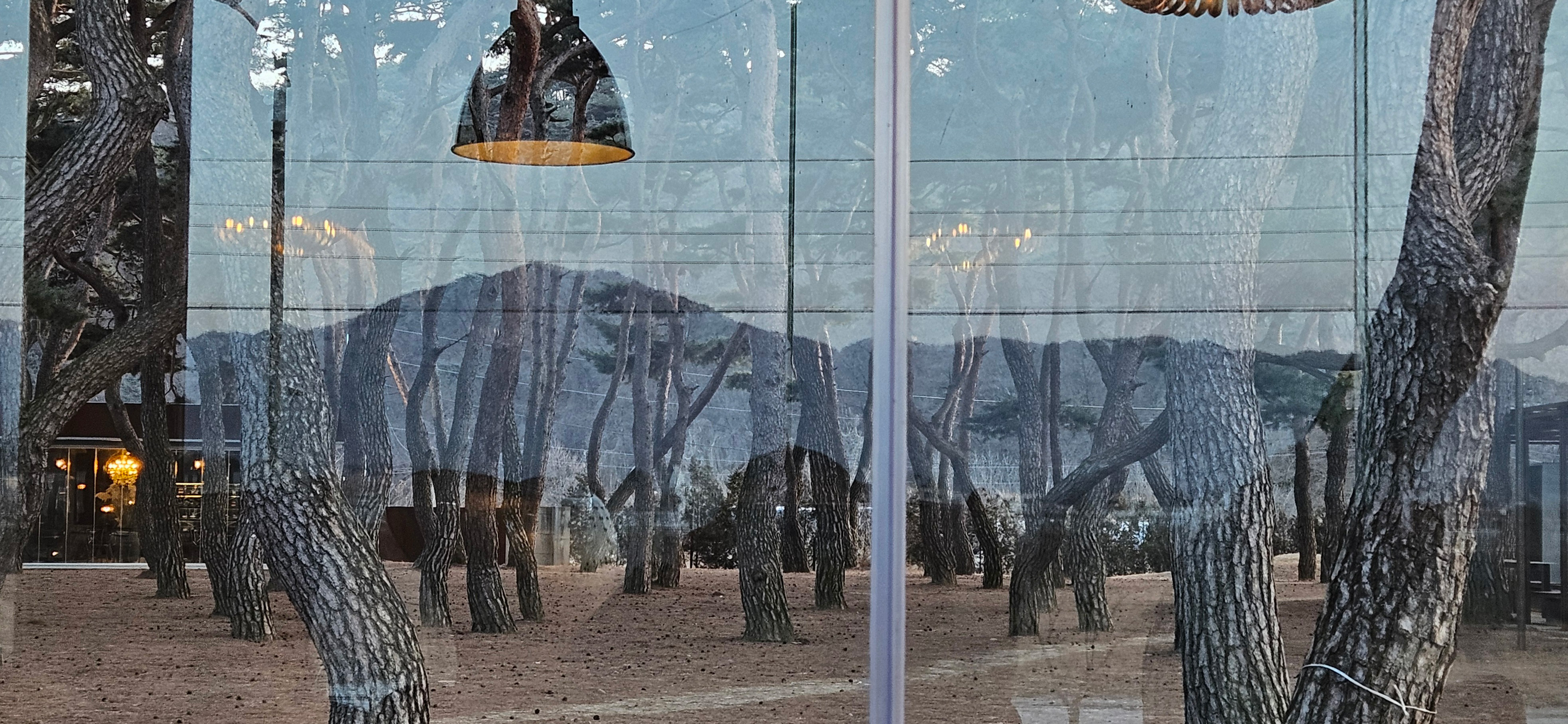 춘천의 소양강변에 자리 잡은 한 카페의 유리창으로 반영된 소나무 숲과 강 건너 산세의 중첩은 풍경의 변화와 공간의 깊이를 느끼게 한다.