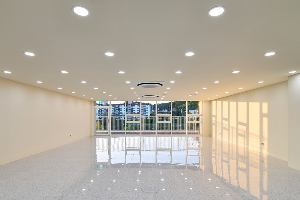 내부마감재 | 폴리싱타일 / 강마루(바닥), 목재흡음보드 /  석고보드 위 친환경 수성페인트(벽)