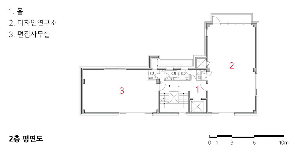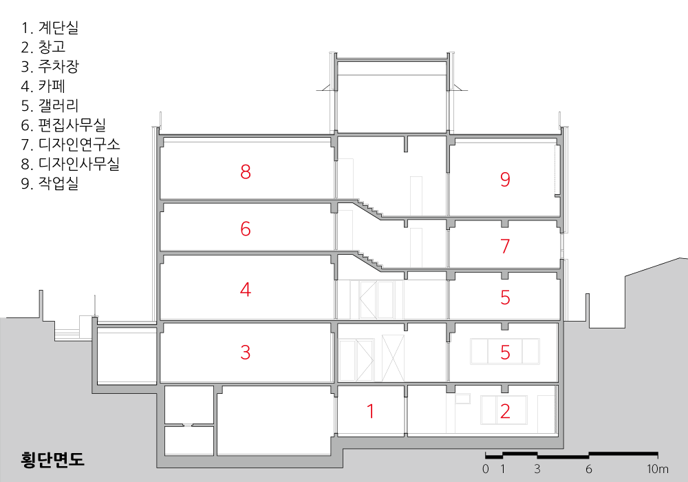 지상층 규모가 3층으로 제한된 건물에서 ‘사람과 장소, 개념과 구조’는 커뮤니케이션 디자인을 필요로 하는 사옥의 건축에서 매우 중요한 이슈였다. 지그재그로 오르내리며 소통하는 공간과 3층 작업실의 천장고를 확보하기 위해 스킵플로어를 적용했는데, 두 매스를 연결하는 중앙부에 계단을 배치하여 1미터 레벨차를 두었고, 1층 진입부와 3층 작업실은 자연스럽게 개방적인 층고를 확보했다. 지하 2층부터 연결되는 중앙의 돌음계단은 각 층의 실들을 연속적인 동선으로 연결한다.