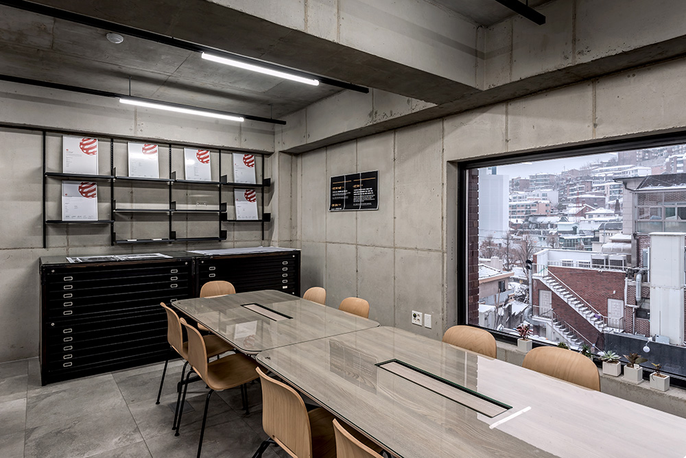 In the building with the ground-height limited up to 3 floors, ‘people and place, concept and structure’ were very important issues in constructing the company building that required communication design. A skip floor was applied to secure the space in which people can communicate while going up and down in zigzags and the ceiling height of the 3rd floor atelier: a staircase was placed in the center connecting the two masses to create a 1m level difference, and the first-floor entrance and the third-floor atelier could naturally have open story heights. The central winding-staircase continued from the second basement level connects the rooms on each floor with a continuous circulation.