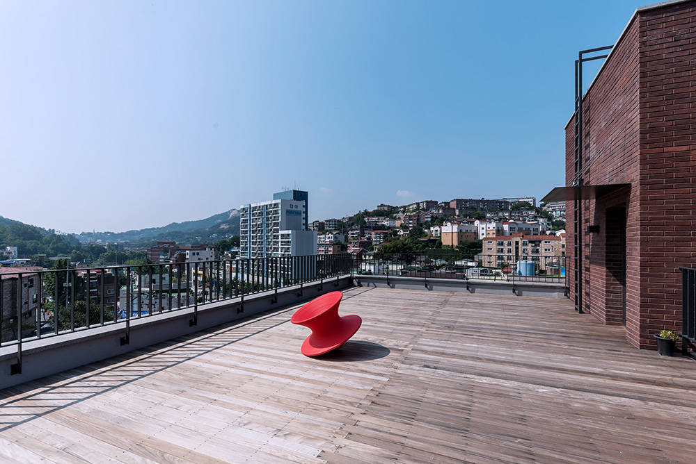 외장재는 붉은 벽돌을 적용해 건축물이 주변 환경에 자연스럽게 스며들게 하고, 내부는 노출콘크리트 마감, 구로강판과 함께 원목으로 마감해 천연 소재의 자연스러움을 공간에 입히고자 했다.
