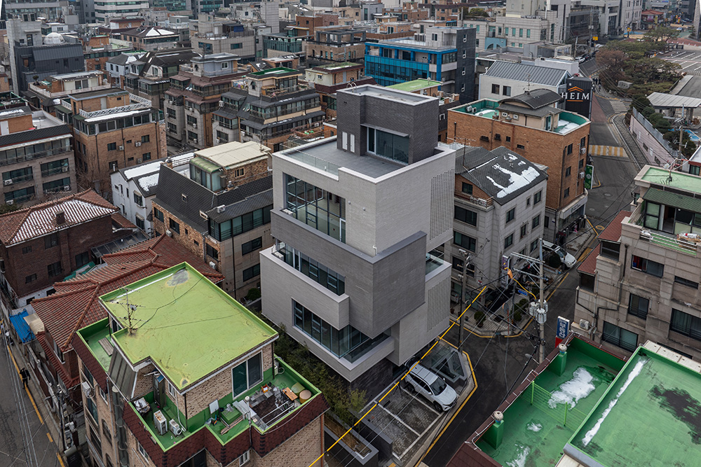 건물의 가장 두드러지는 특징은 층별로 매스를 독립적으로 구성한 부분이다. ‘4×4’라는 이름에 맞게 각기 다른 색의 벽돌로 치장된 각각의 매스는 벽돌의 매시브함에 힘입어 그 개별적 태도를 분명히 드러내고 있다. 층별로 구분된 네 개의 매스는 그 자체로 독립된 방이다. 임차인의 입장에서 생각해 볼 때 나만의 독립적인 공간을 가질 수 있다는 것은 높은 가치를 부여할 수 있는 요인이기에, 임대 수익 측면에서 우수한 전략이 된다. 수차례 건축주와 소통하고 다양한 입면을 검토해가며 탄생한 매스의 분절 전략은, 이 건물이 여기에 존재해야 하는 방식 그 자체로 존재하고 있는 것이다.