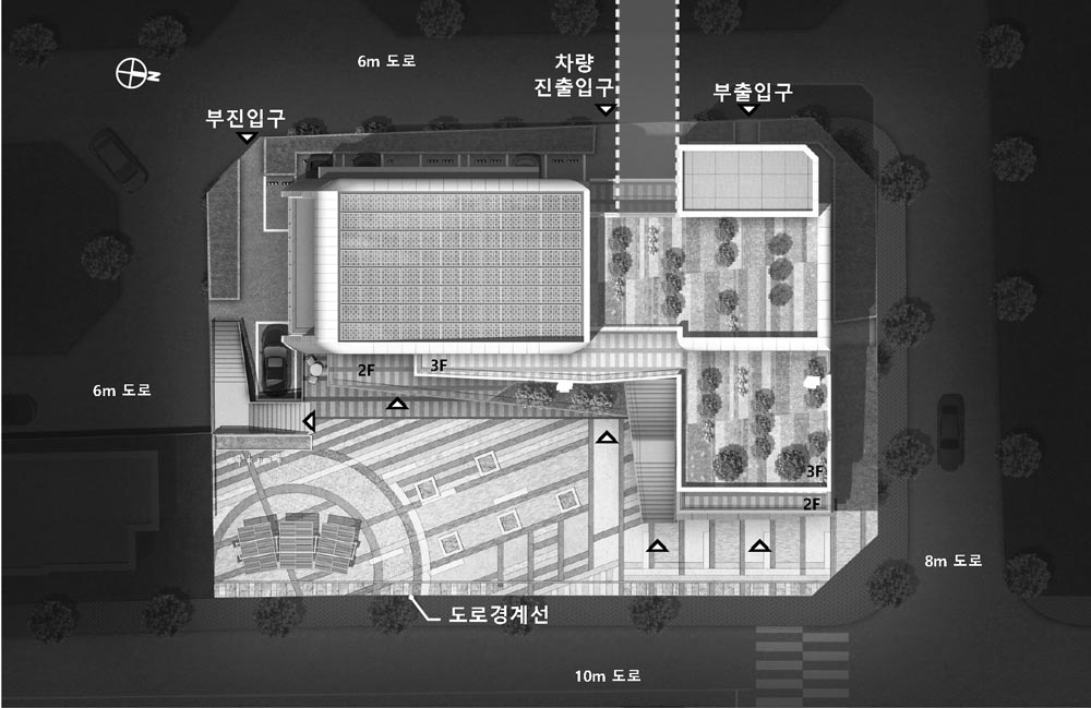 대상부지는 노후된 주거지역에 위치했고, 좁은도로 등 지역주민을 위한 문화, 휴게공간이 상대적으로 부족한 상황이었다. 인접한 주민공동이용시설과 주변을 연계하는 데크, 보행가로를 건물 내부로 자연스럽 게 들여 오고자 했다.