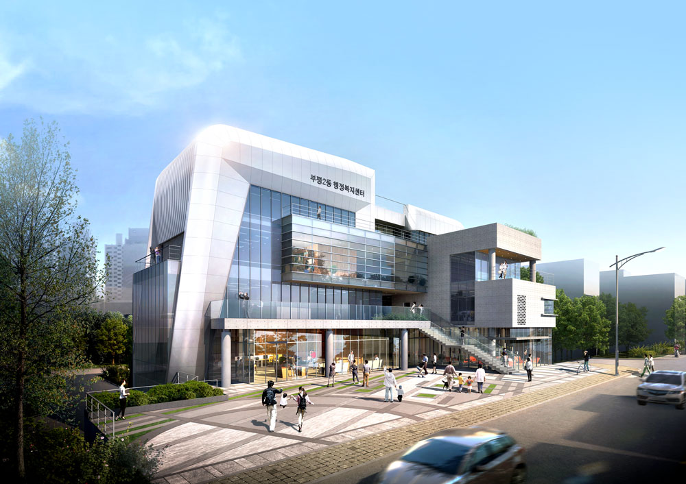 | 부평2동 행정복지센터 발주자 인천광역시 부평구 설계자 주성진 KIRA | (주)성학 건축사사무소 설계팀 주성진, 차윤선, 이형일 대지위치 인천광역시 부평구 부영로 21-28 일원 대지면적 1,243.00㎡ 건축면적 605.45㎡ 연면적 2,334.27㎡ 건폐율 48.71% 용적률 140.55% 규모 지하 1층, 지상 4층 구조 철근콘크리트조 외부마감재 로이삼중유리, 알미늄접합패널, 노출콘크리트 패널 내부마감재 지정석물갈기, 비닐타일, 악세스플로어, 우드후로링 |