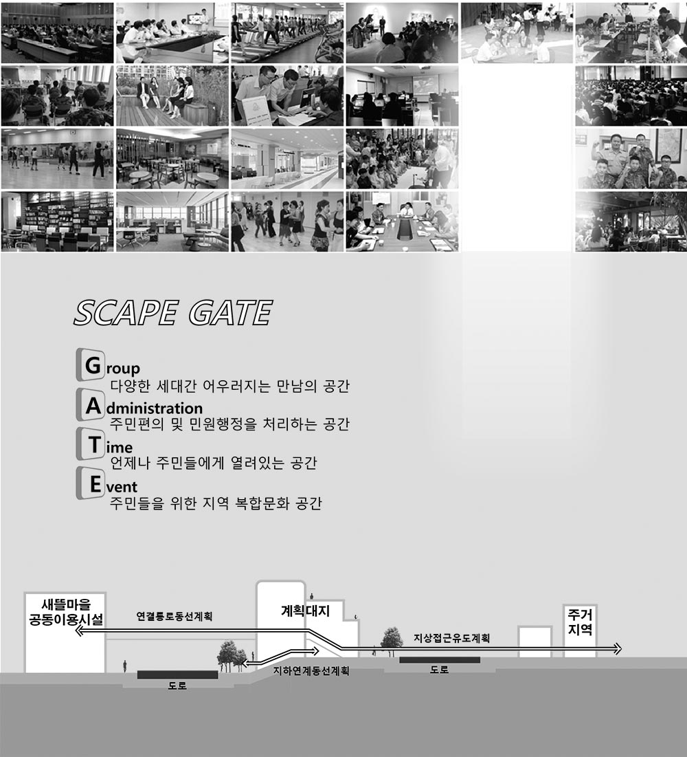 지역주민을 위한 문화공간과 열린공간을 하나의 건물에 담고, 그 사이공간을 비워 자연과 연결하여 활력 있는 공간을 제안했다. 외부공간은 대지의 형상에 최대한 순응하면서, 열린배치로 주민들에게 문화 및 휴 식의 공간을 제공한다. 내부공간은 시설별 기능을 기준으로 매스를 분절시키고, 업무공간과 주민편의시 설 등 기능별 조닝계획과 출입구 분리를 계획했다. 지역주민 생활속으로 편안하게 관입하는 공간계획과 환경친화적 계획과 친환경 에너지 적용으로 유지비 용 절감 및 자원재활용 기술 도입을 통한 모범적 자치센터를 제공한다.
