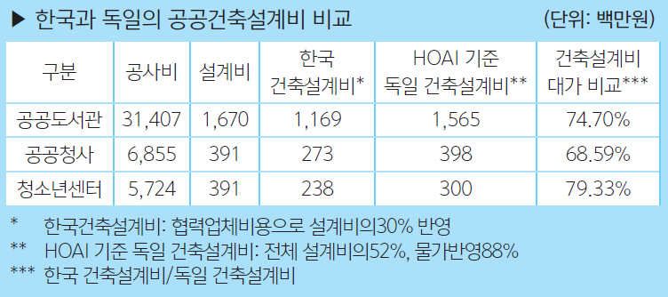 위의 비교 사례를 보면 한국의 공공건축 설계비는 독일의 약 70∼80%라는 것을 알 수 있다. 건축설계비가 독일 대비 낮다는 점 외에 또 다른 문제는 이 결과가 설계 변경이 없고, 설계 변경에 의한 기간이 늘어나지 않고, 공사비가 상승하지 않고, 협력업체 비용이 설계비의 약 30% 정도라고 전제한 경우라는 점이다. 그렇지 않은 경우 한국과 독일의 건축설계비 차이는 더욱 늘어난다. 독일에서도 발주처가 설계 변경을 요청할 수도 있다. 그런 경우는 실비 정산 방식으로 설계비가 추가로 산정되고, 그에 따라 설계 기간도 늘어나게 된다. 그러나 우리나라는 아직도 대가 없이 빈번히 설계변경을 요구하면서 설계 기간도 지키도록 한다. 또한 설계대가 증액 없이 안전 관련 요구사항이 복잡해지면서 협력업체 비용도 함께 늘고 있다. 더욱이 현재 건축시장의 80%가 넘는 민간건축시장에는 이런 기준조차 없고 실질적인 설계 대가는 공공건축 설계대가 보다 현저히 더 낮은 실정이다.