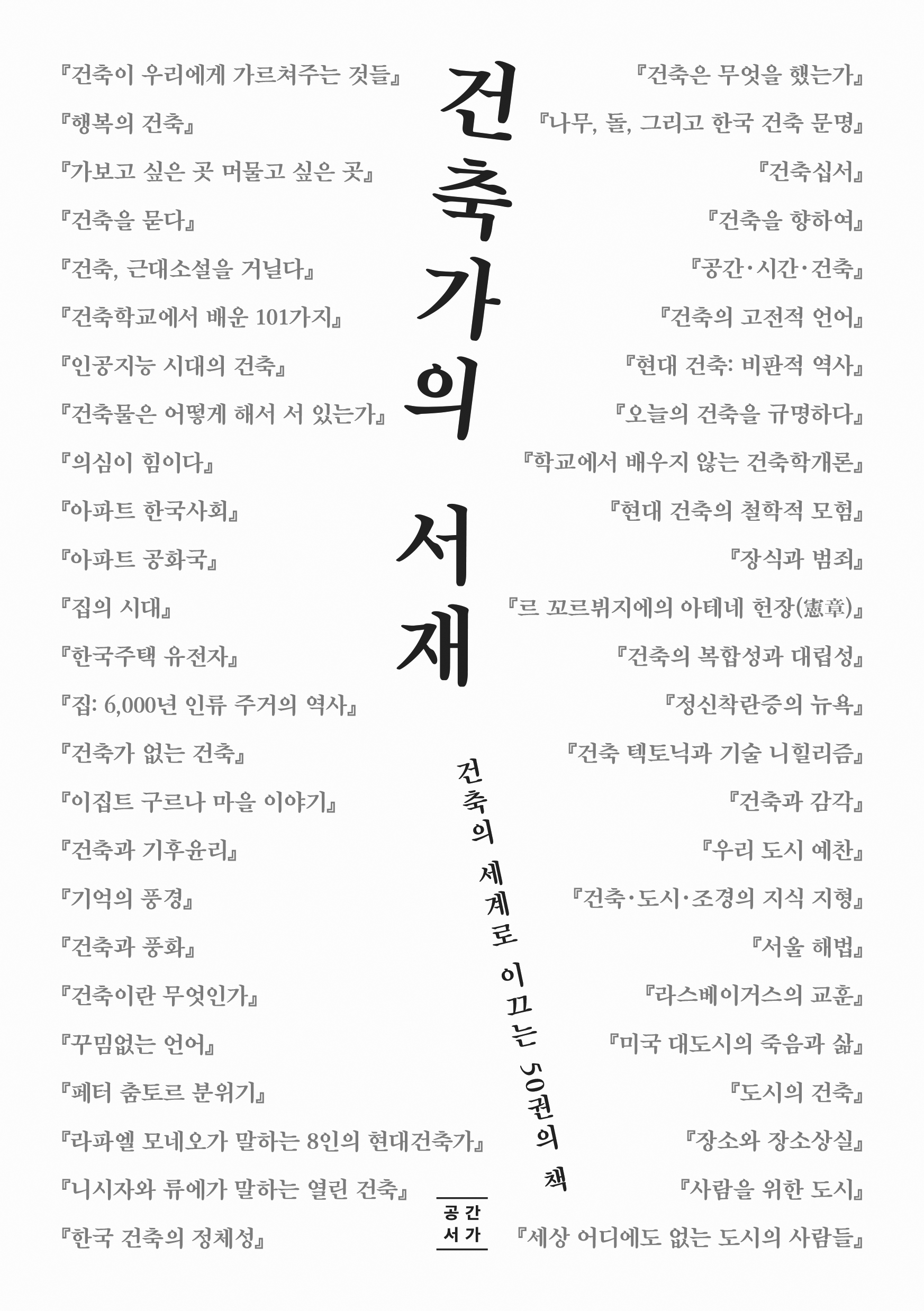 동양과 서양, 고전과 현대, 주거와 도시를 아우르는 건축 필독서 50권을 소개하는 책으로, 건축 전문가가 엄선한 책들을 여섯 개의 장으로 구분해 정리한다. ‘교양’에서는 건축을 통해 일상적 사유를 펼칠 수 있는 책을, ‘주거’에서는 우리 생활과 맞닿은 주택·아파트 등에 관한 전문가들의 관점을 소개한다. ‘건축가’에서는 정기용, 승효상, 미스 반 데어 로에, 프랑크 게리 등의 건축 언어를 탐구하는 한편 후반부인 ‘역사’와 ‘이론’에서는 건축과 연관한 철학적·비평적 담론을 조망한다. 마지막 ‘도시’에서는 건축의 집합이라 할 수 있는 도시를 살펴보며 건축 지식의 지평을 넓힌다.