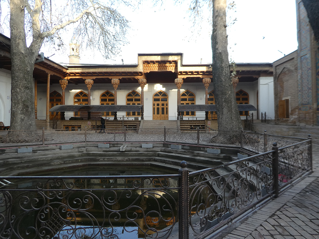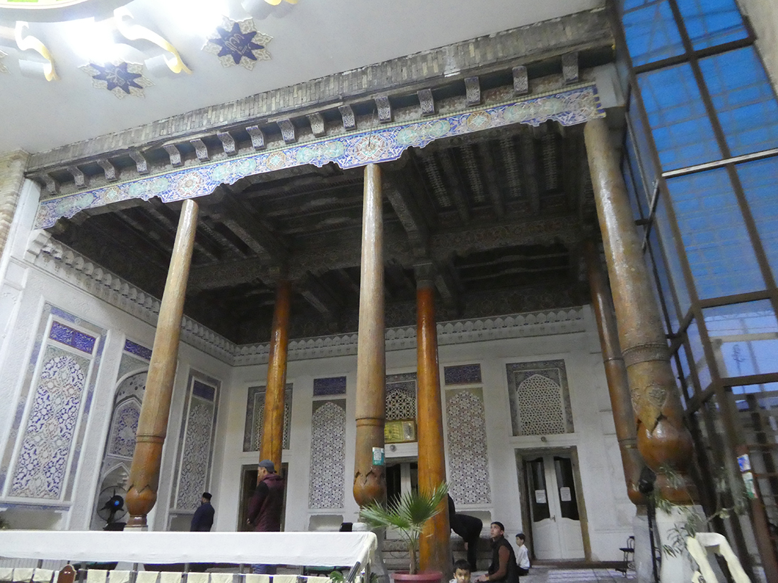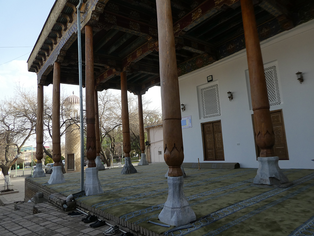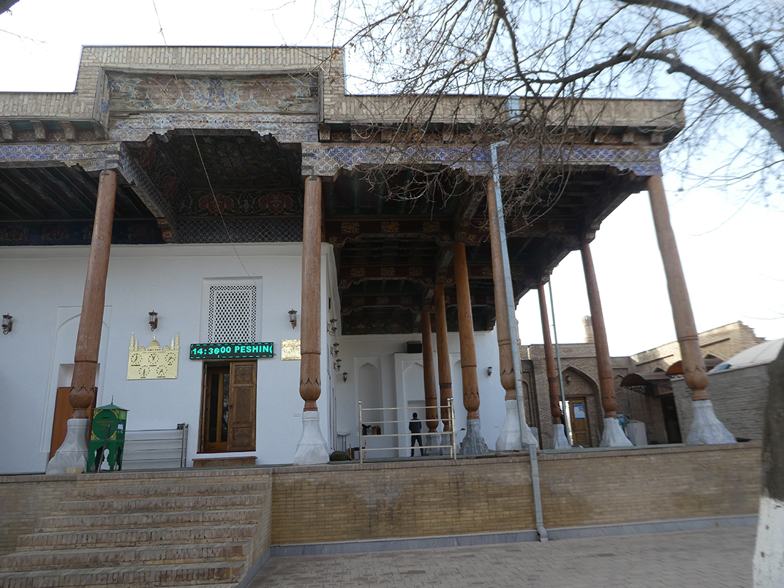 레기스탄 광장에서 약 1킬로미터 정도 거리라 지도를 보고 찾아갔다. 건물의 전경을 볼 수 없을 정도였고, 상부는 캐노피로 덮고 뒷부분도 좁은 골목이라 사진을 찍기는 어려웠다. 게다가 기도 시간이어서 주요 공간(남성용 홀)을 들어가기는 어려웠지만, 특별히 허락받아 아이반 부분은 볼 수 있었다. 동네에서 활성화된 모스크다.