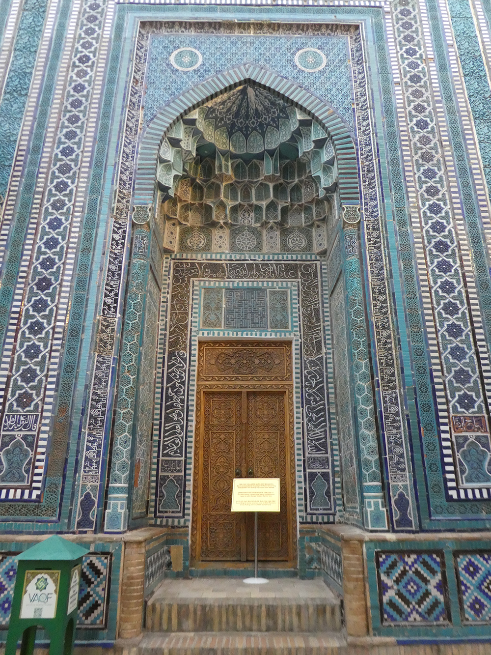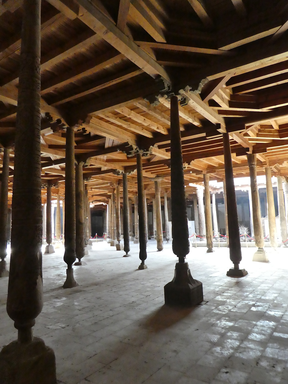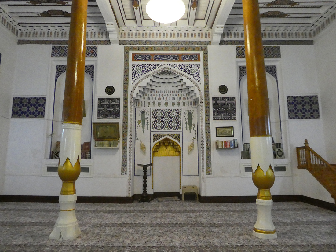 레기스탄 광장에서 약 1킬로미터 정도 거리라 지도를 보고 찾아갔다. 건물의 전경을 볼 수 없을 정도였고, 상부는 캐노피로 덮고 뒷부분도 좁은 골목이라 사진을 찍기는 어려웠다. 게다가 기도 시간이어서 주요 공간(남성용 홀)을 들어가기는 어려웠지만, 특별히 허락받아 아이반 부분은 볼 수 있었다. 동네에서 활성화된 모스크다.