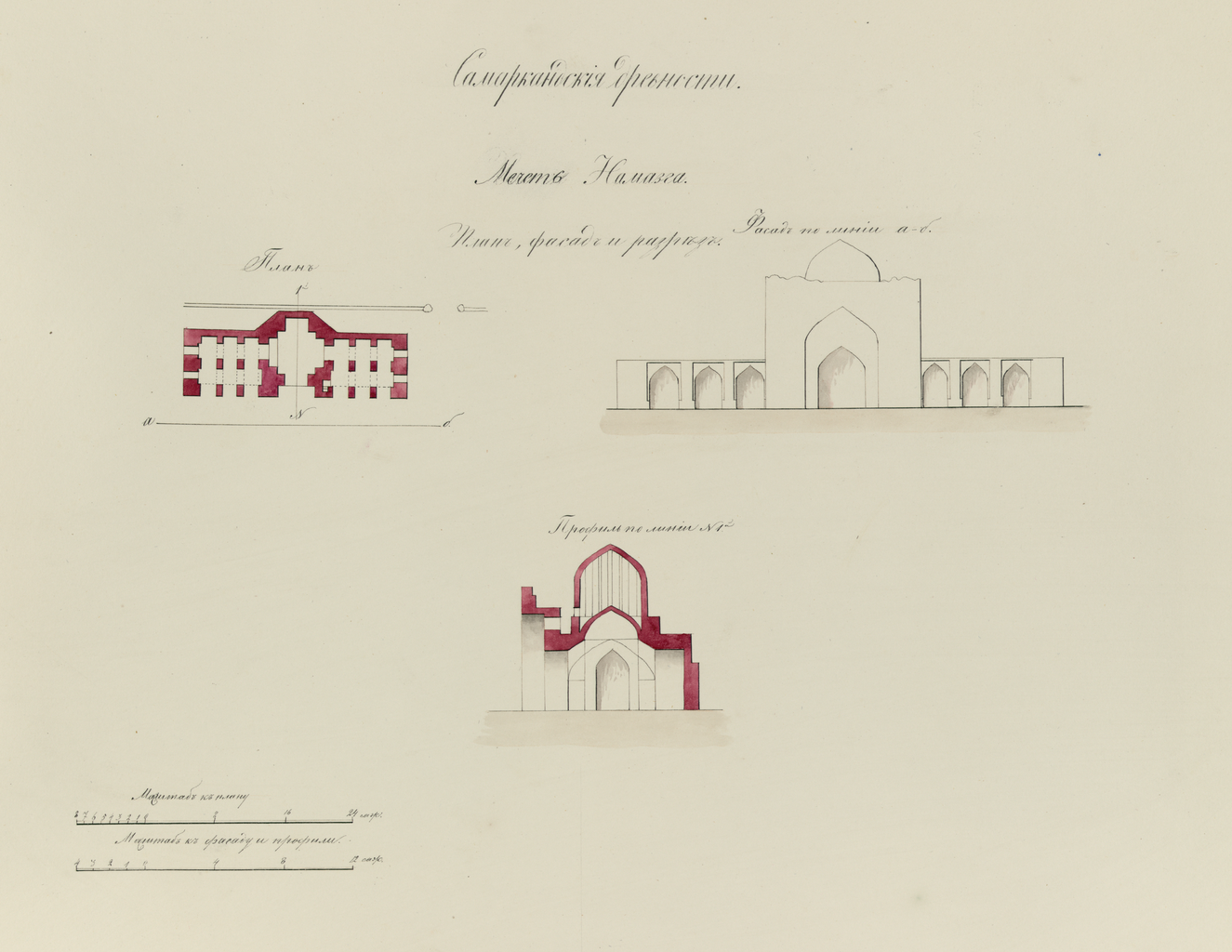 사마르칸트 모스크의 건축물은 규모는 작아도 이슬람 건축 전통의 요소들을 간직하고 있다. ‘카나카(khanaka)’ – 내부 미흐랍이 있는 정사각형, 때로는 직사각형의 전제가 모스크의 핵심이다.