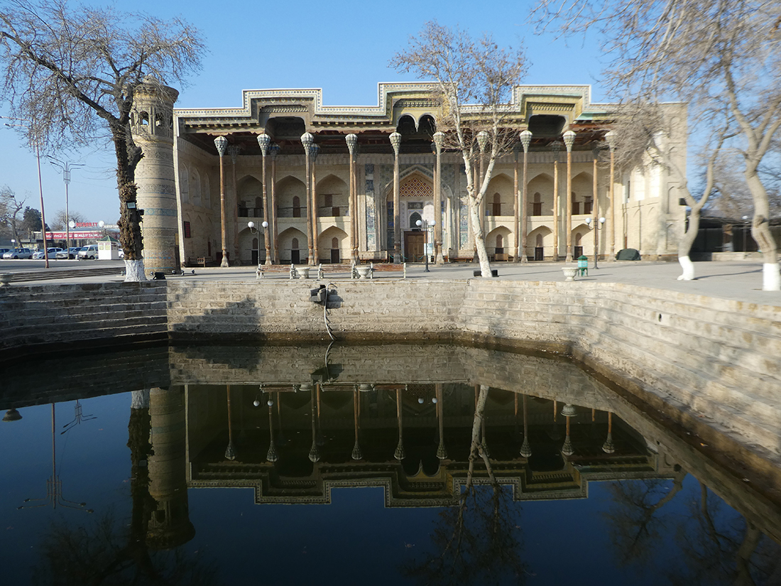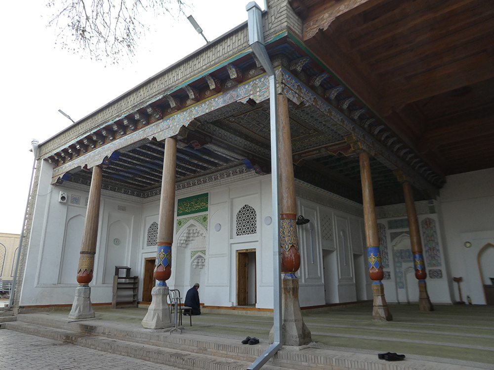 레기스탄 광장에서 약 1킬로미터 정도 거리라 지도를 보고 찾아갔다. 건물의 전경을 볼 수 없을 정도였고, 상부는 캐노피로 덮고 뒷부분도 좁은 골목이라 사진을 찍기는 어려웠다. 게다가 기도 시간이어서 주요 공간(남성용 홀)을 들어가기는 어려웠지만, 특별히 허락받아 아이반 부분은 볼 수 있었다. 동네에서 활성화된 모스크다.