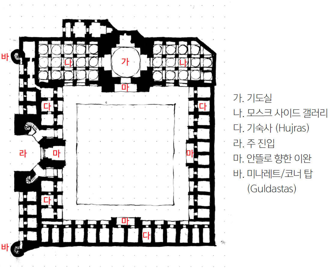 이슬람 건축에서 예배 공간(모스크), 교육 및 수행공간(마드라사), 사후 공간(마우솔레움/영묘)을 따로 설명하기는 쉽지 않다. 예배공간과 교육 공간이 함께 있던가 교육공간이 사후 공간과 같이 있던가, 모두가 다 함께 있던가 대개 앙상블로 함께 있기 때문이다. 그럼에도 불구하고 각자의 가치를 존중하여 공간별로 소개를 하고 문맥을 어렵지 않게 이어 가기 위해 전 후에 부언 설명을 하기로 한다.