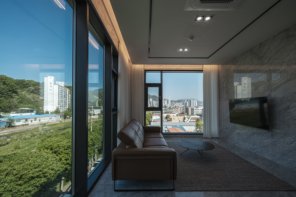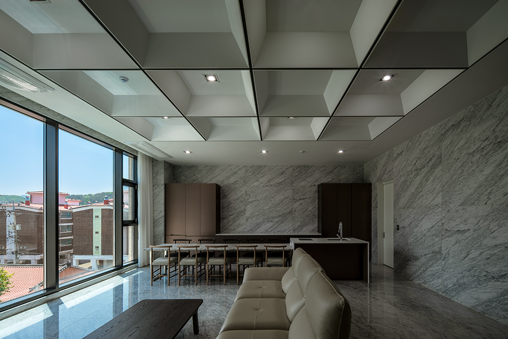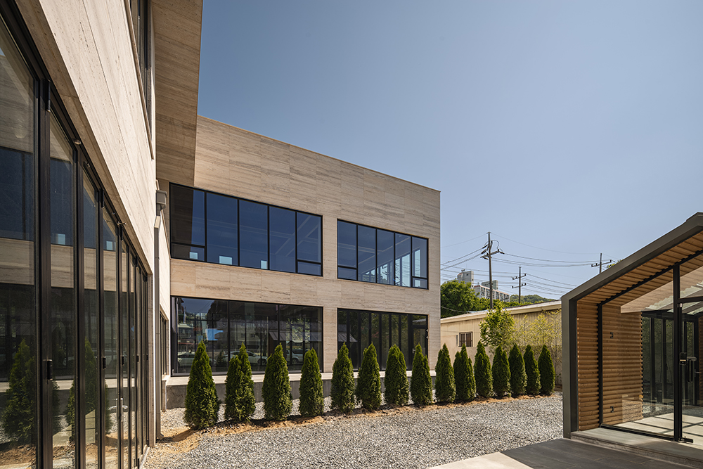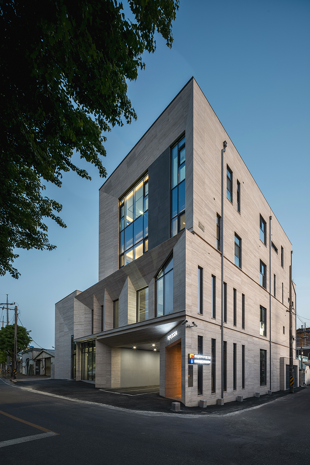 Through the use of modern design, luxurious materials, and effective integration of natural elements, the building exudes a refined and elegant ambiance. The diagonal elements on the exterior and the ascending patterns of Bianco marble inside add dynamic aspects to the space. Like the enduring riverbanks, Bomun Mountain, and Sikjang Mountain, this building, with its robust and enduring travertine characteristics, is expected to maintain its form and color over time, becoming a lasting fixture in the area.