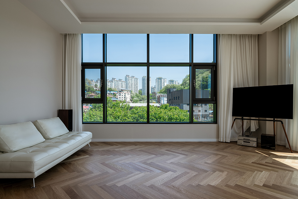 1층과 2층은 카페로 활용되며, 내·외부의 완충 공간으로 자연스럽게 연결했다. 외부에서 완충공간을 지나 중정으로 들어서면 작은 화단과 텃밭을 통해 자연과 교감할 수 있다. 내부는 천장고를 높여 개방감을 극대화했다. 이러한 구조는 주택의 개방성과 사적인 공간을 동시에 만족시킨다. 3층은 거실, 부엌, 화장실 등 기본 공간을 배치해 손님이 왔을 때 접근성을 높였으며, 작은 정원을 조성해 자연을 느낄 수 있는 공간을 마련했다. 4층은 완전한 가족 구성원들만의 주거 공간으로 4층에 별도로 거실을 두어 가족 간의 소통을 원활하게 했다.