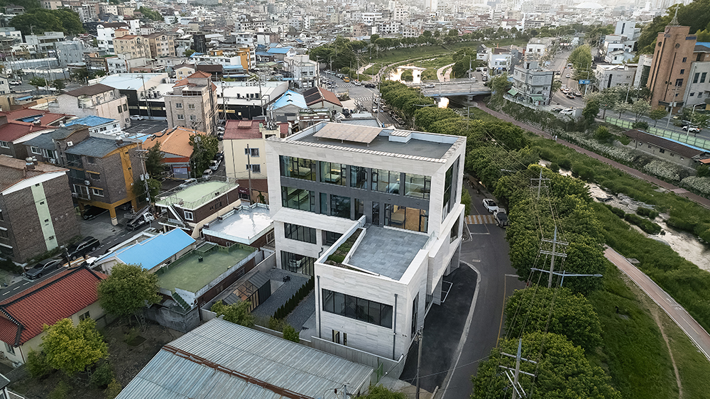 Through the use of modern design, luxurious materials, and effective integration of natural elements, the building exudes a refined and elegant ambiance. The diagonal elements on the exterior and the ascending patterns of Bianco marble inside add dynamic aspects to the space. Like the enduring riverbanks, Bomun Mountain, and Sikjang Mountain, this building, with its robust and enduring travertine characteristics, is expected to maintain its form and color over time, becoming a lasting fixture in the area.