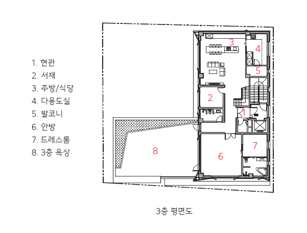 1층과 2층은 카페로 활용되며, 내·외부의 완충 공간으로 자연스럽게 연결했다. 외부에서 완충공간을 지나 중정으로 들어서면 작은 화단과 텃밭을 통해 자연과 교감할 수 있다. 내부는 천장고를 높여 개방감을 극대화했다. 이러한 구조는 주택의 개방성과 사적인 공간을 동시에 만족시킨다. 3층은 거실, 부엌, 화장실 등 기본 공간을 배치해 손님이 왔을 때 접근성을 높였으며, 작은 정원을 조성해 자연을 느낄 수 있는 공간을 마련했다. 4층은 완전한 가족 구성원들만의 주거 공간으로 4층에 별도로 거실을 두어 가족 간의 소통을 원활하게 했다.