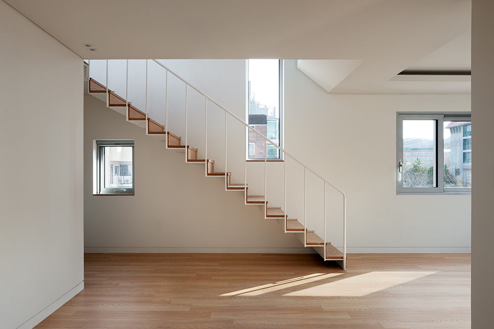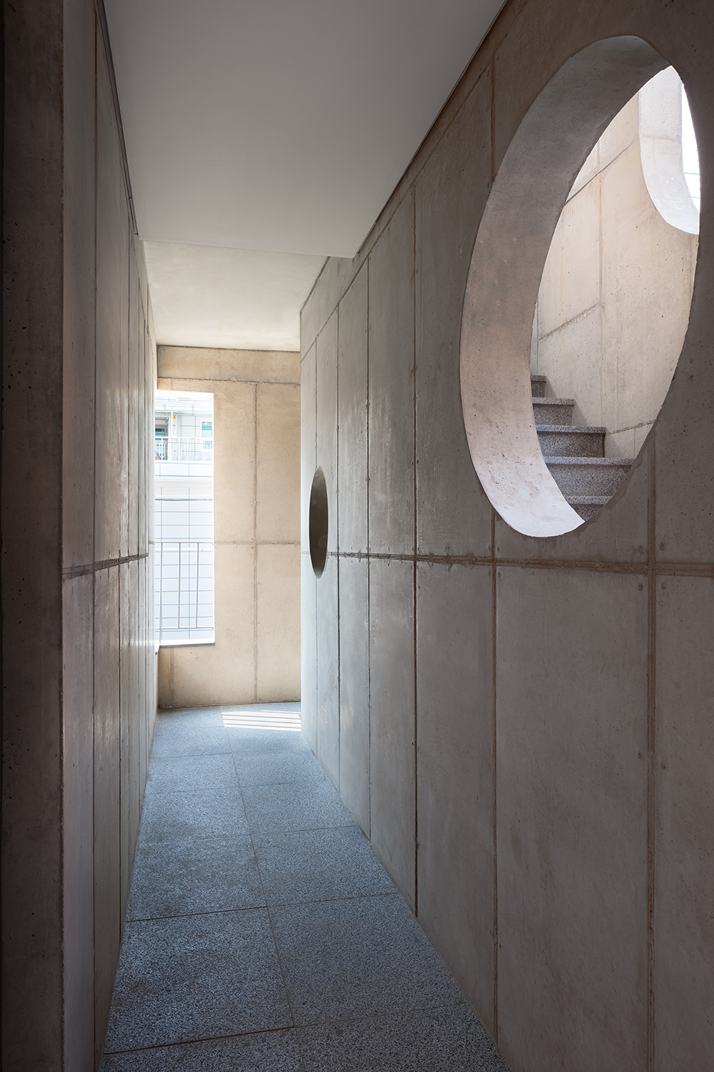 협소한 대지에서의 계단실은 최대한 북측으로 배치되어야 했다. 전용면적을 최대한 확보하기 위해서 공용부의 내·외부 마감을 유로폼 노출콘크리트로 처리해 조금이라도 더 거주자를 위해 쓰이도록 했다. 북측의 계단실은 단순히 수직 이동의 목적만으로 사용되는 어두컴컴한 공간이 되지 않도록 적절한 위치에 자유스러운 형태의 개구부를 뚫어 채광을 확보하고 외부와 시선을 주고받도록 했다. 내력벽 사이의 개구부(Cheese Eyes)는 빛의 관통뿐 아니라 오가는 거주자들이 갑자기 마주쳐 놀랄 수 있는 상황을 사전에 방지하는 ‘눈’으로서의 장치이다.