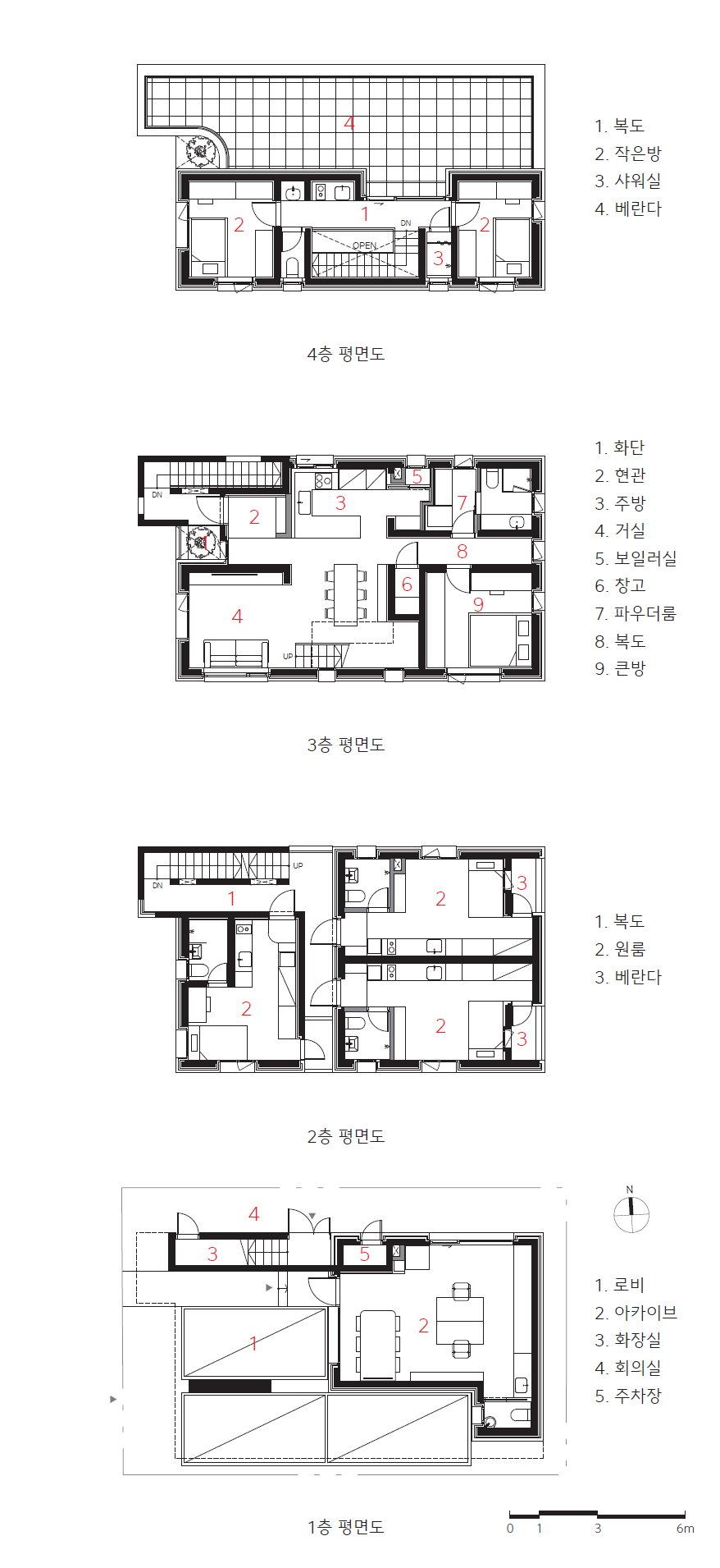 1층은 건물에 입주할 거주자뿐 아니라 도로를 지나다니는 보행자가 건물과 관계 맺게 되는 시각적 스킨십이 일어나는 공간인 동시에, 건물이 이곳에 단단히 뿌리내리게 함으로써 타임리스한 장소성을 가질 수 있게 만드는 시작점이다. 필로티 주차장을 취할 수밖에 없는 상황이지만, 기둥 수를 최소화하고 상부 매스와 이격하고 다른 성질의 재료를 사용해 상부를 가볍게 받치도록 처리했다. 또한 기하학적 형태를 살려 한 그루의 나무가 땅으로부터 솟아난 듯 견고히 이곳을 움켜쥐도록 계획했다.